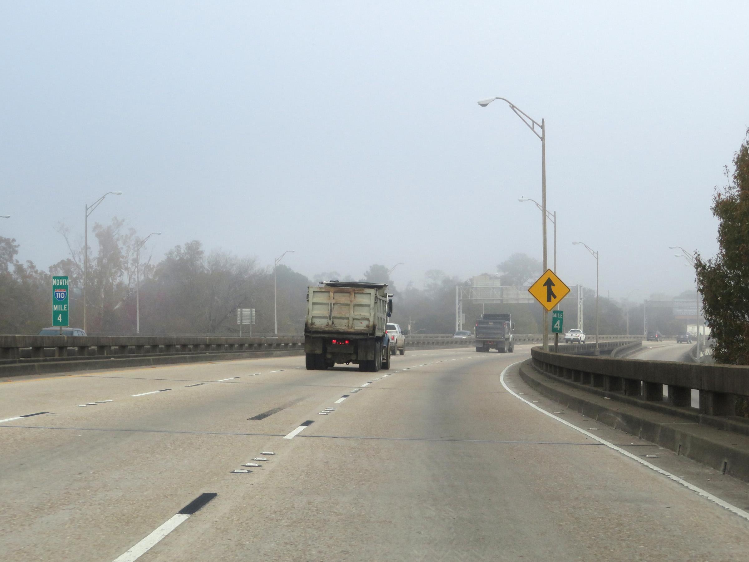 View on Interstate 110 North at mile marker 0.2, as traffic from Interstate 10 East merges into it on the left. (Photo taken 12/10/20). |