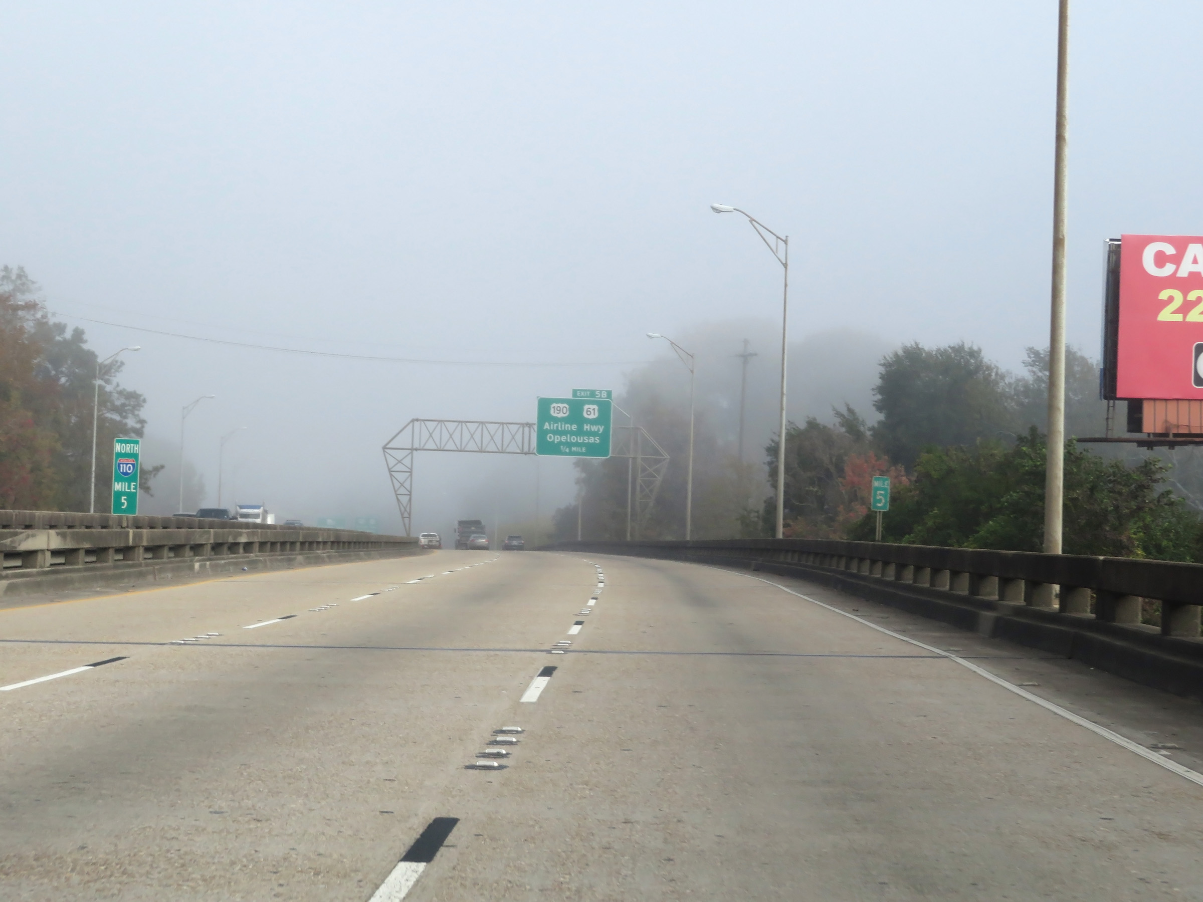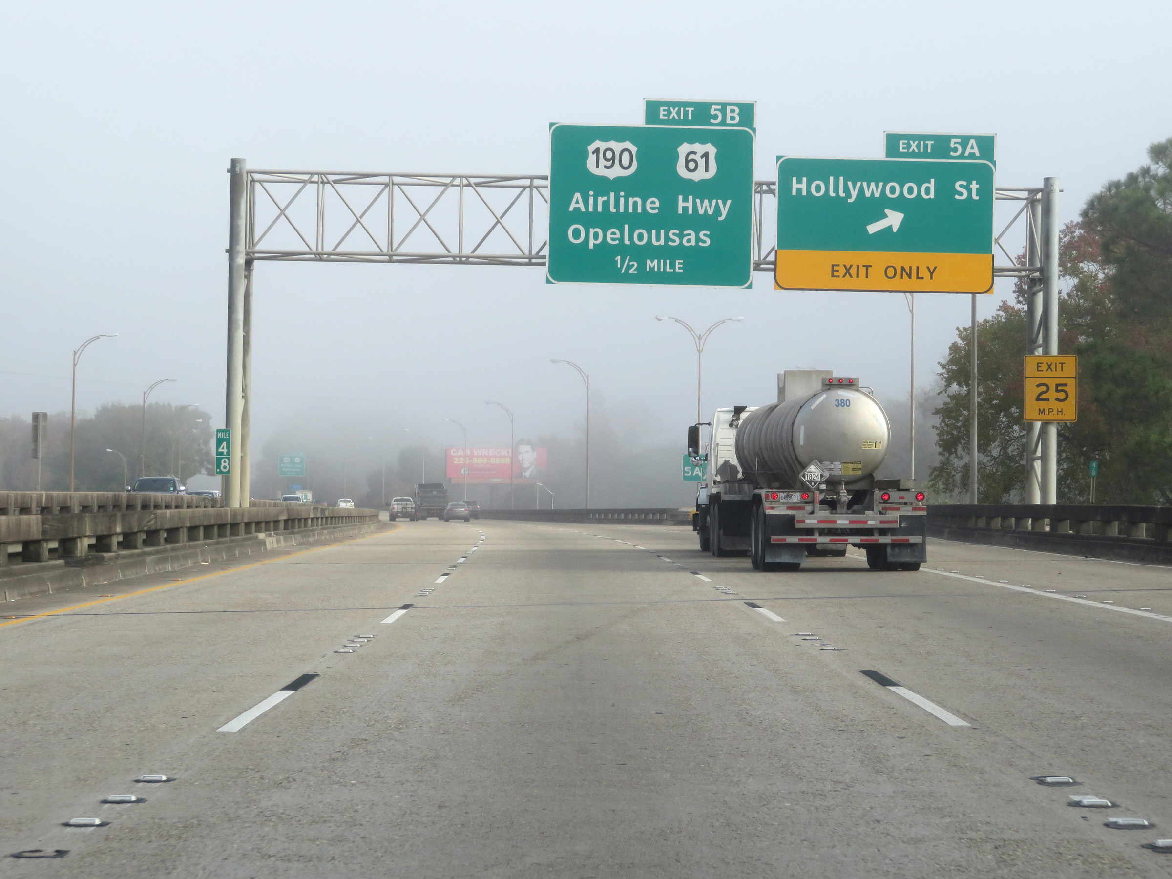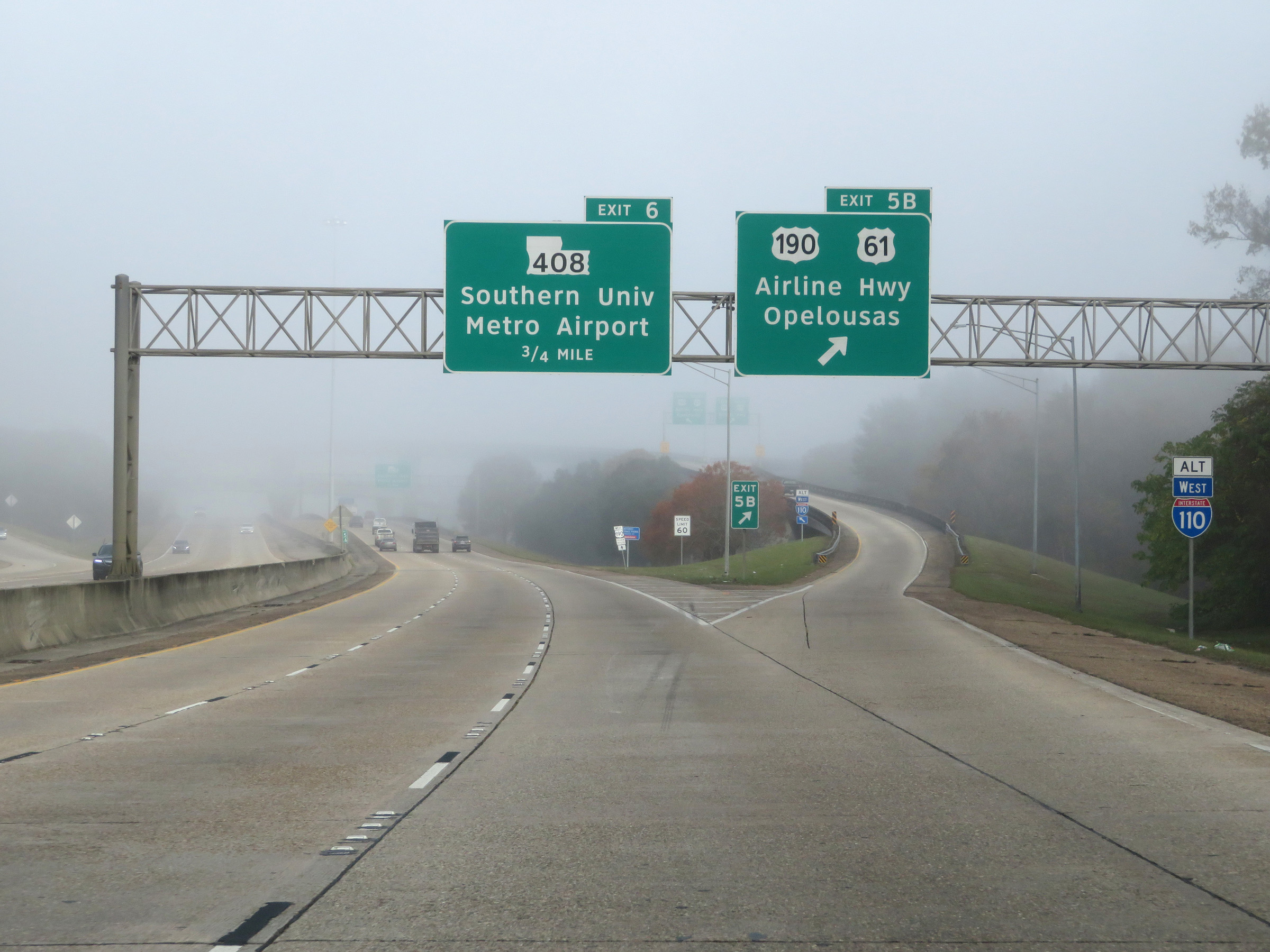 Interstate 110 North at Exit 5B: US 190 / US 61 - Airline Hwy / Opelousas. Did you spot the sign error here? (Photo taken 12/10/20). |