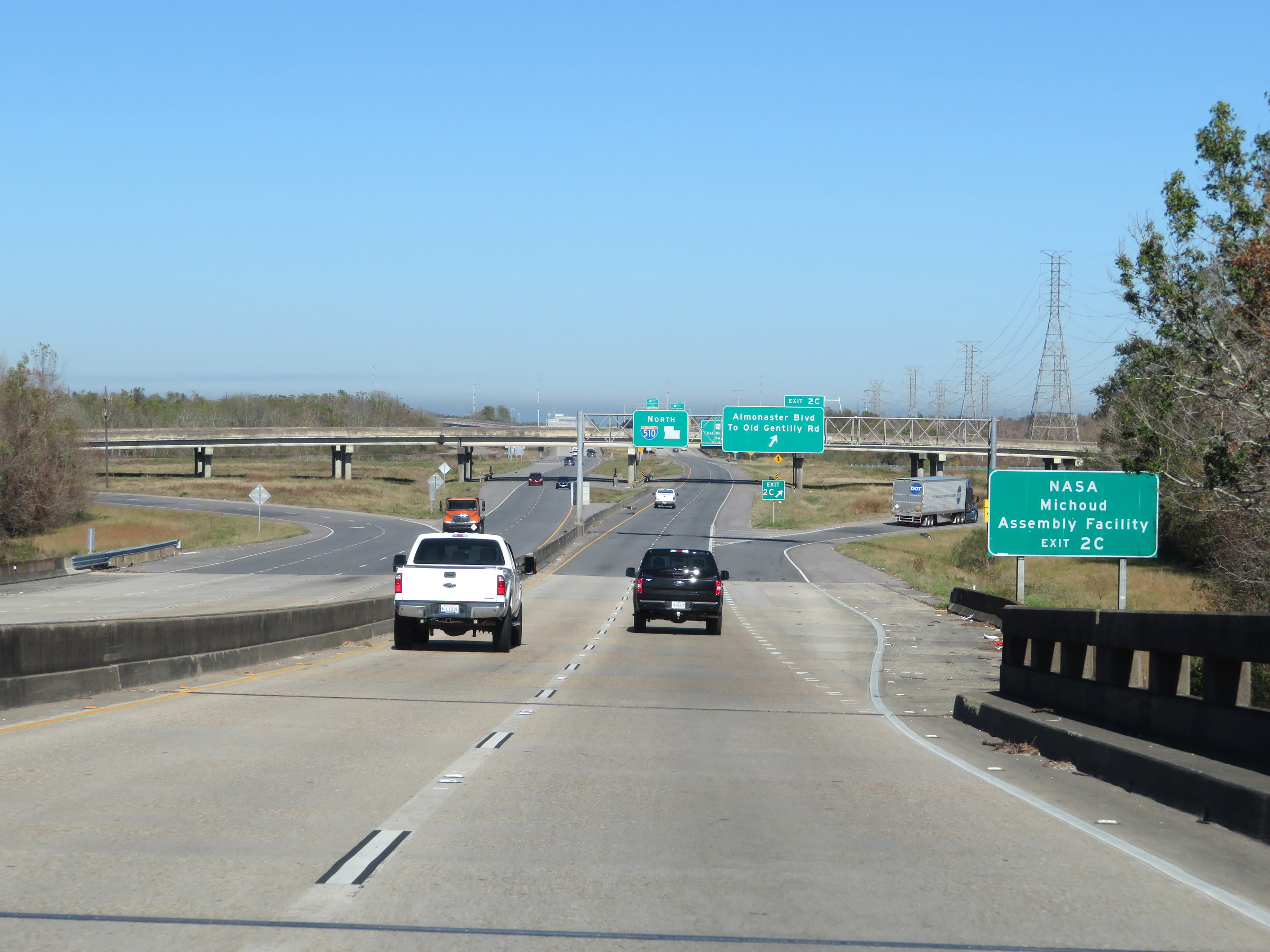 |  | Interstate 510 North as it begins. LA 47 will continue to run concurrently with it for the full 3-mile length of I-510. Take Exit 2C to the NASA Michoud Assembly Facility. (Photo taken 12/9/20). |