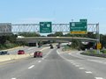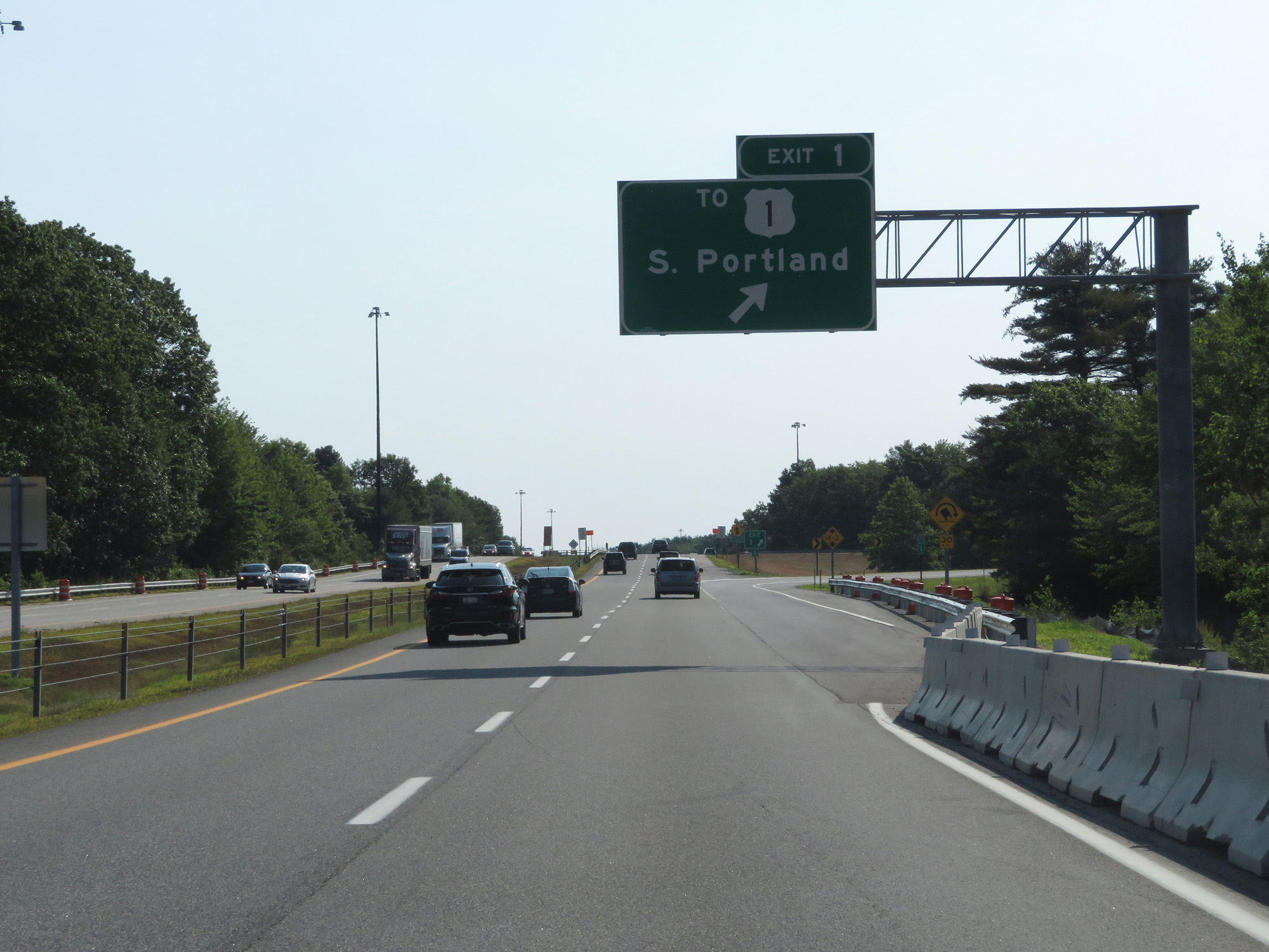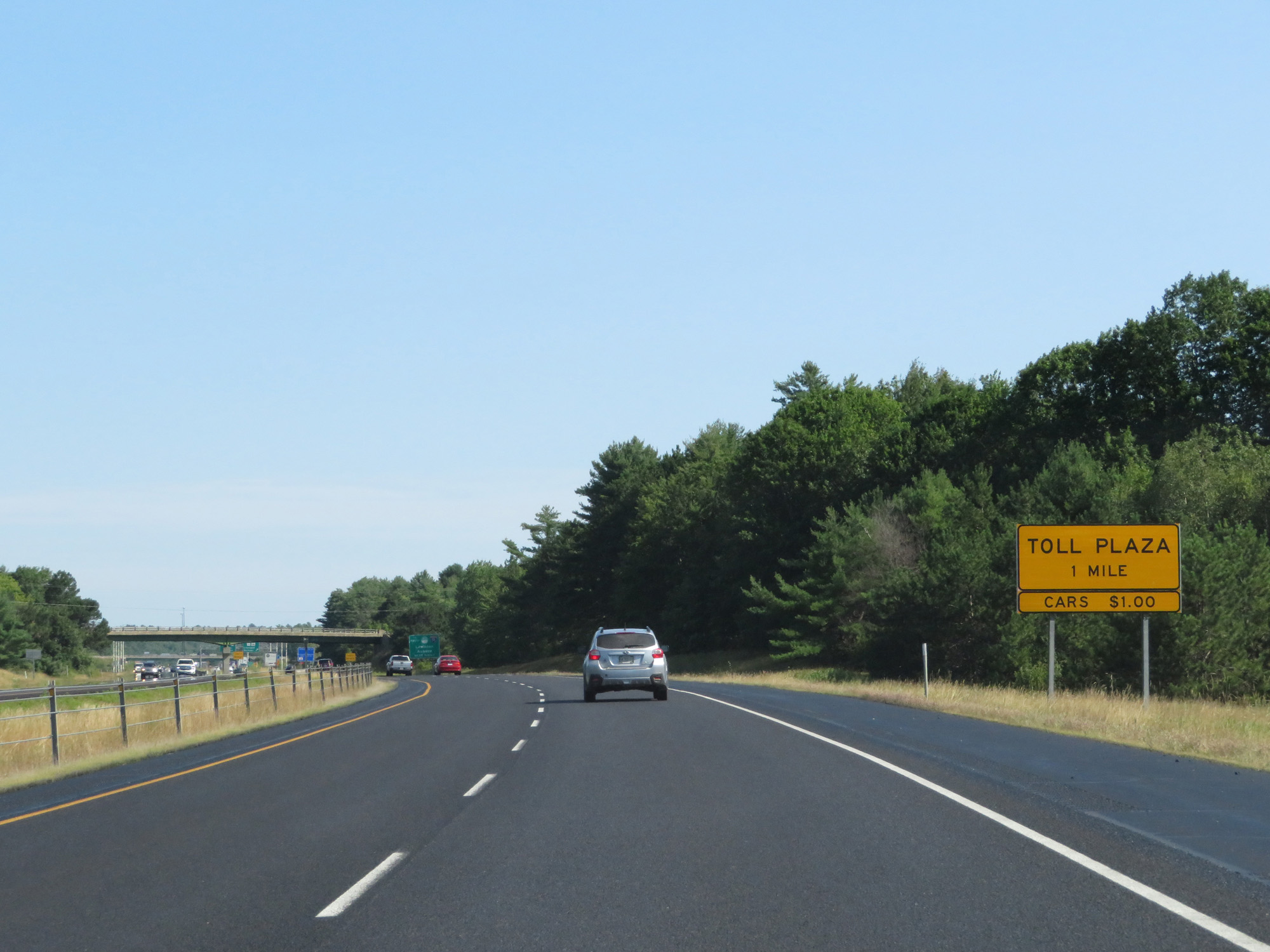 Interstate 295 North approaching the toll plaza for Interstate 95 (Maine Turnpike) - 1 mile. At the time, the toll due was $1.00 for cars. (Photo taken 8/7/17). |