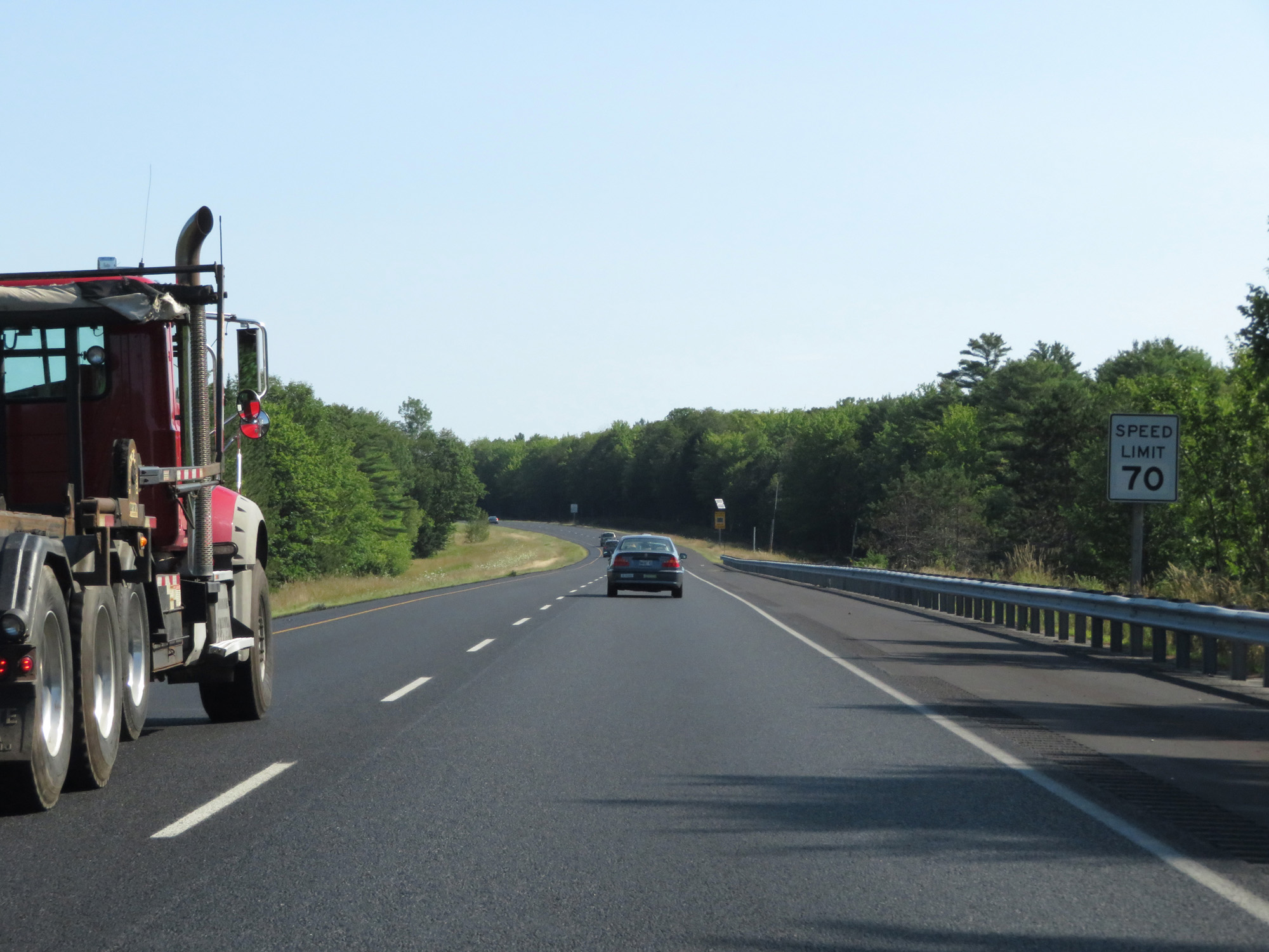 North of Exit 31, the speed limit increases to 70 mph on Interstate 295 North. This is the standard speed limit on most (but not all) rural Interstate highways in Maine. (Photo taken 8/7/17). |