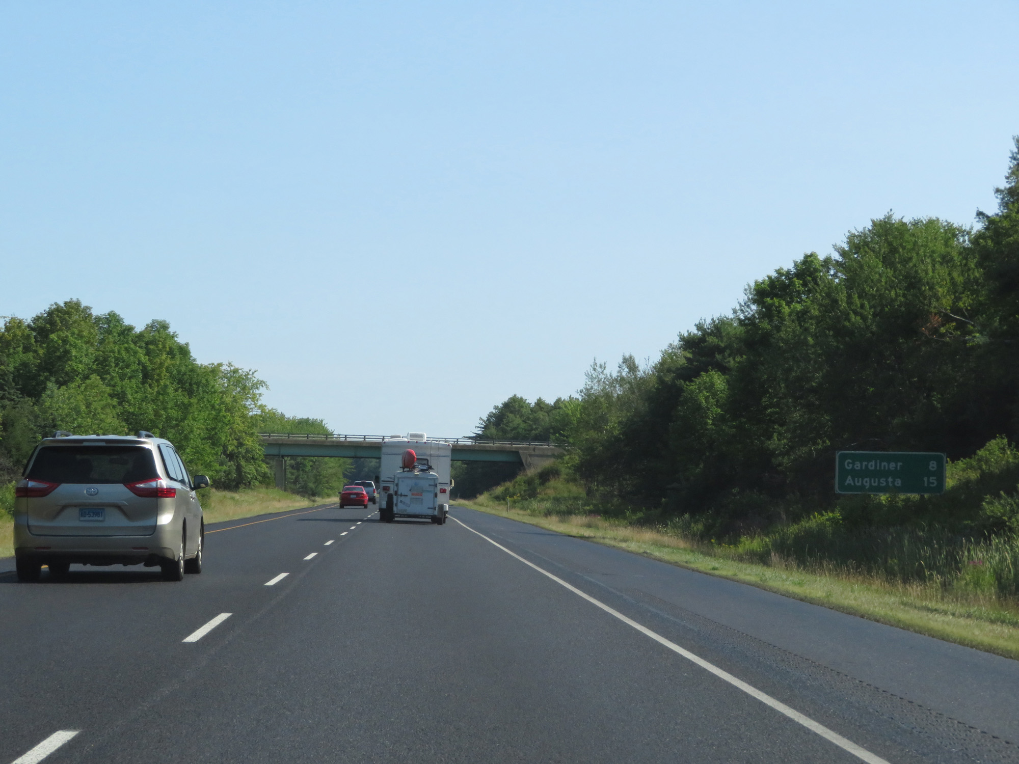 Mileage sign on Interstate 295 North. It's 8 miles to Gardiner and 15 miles to Augusta. (Photo taken 8/7/17). |