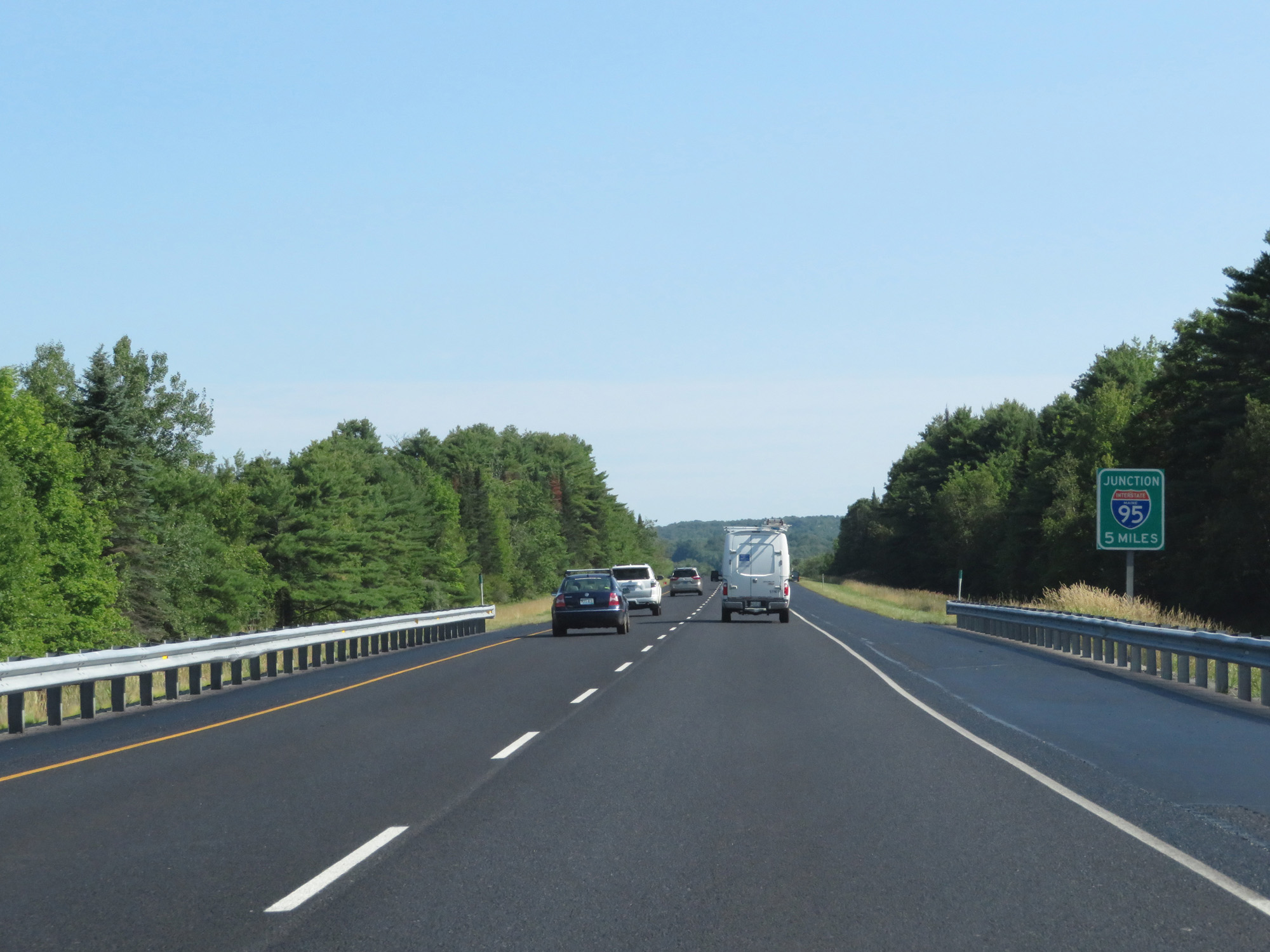 As this sign reads, the junction of Interstate 95 (Maine Turnpike), and the northern terminus of Interstate 295, is 5 miles ahead. (Photo taken 8/7/17). |