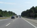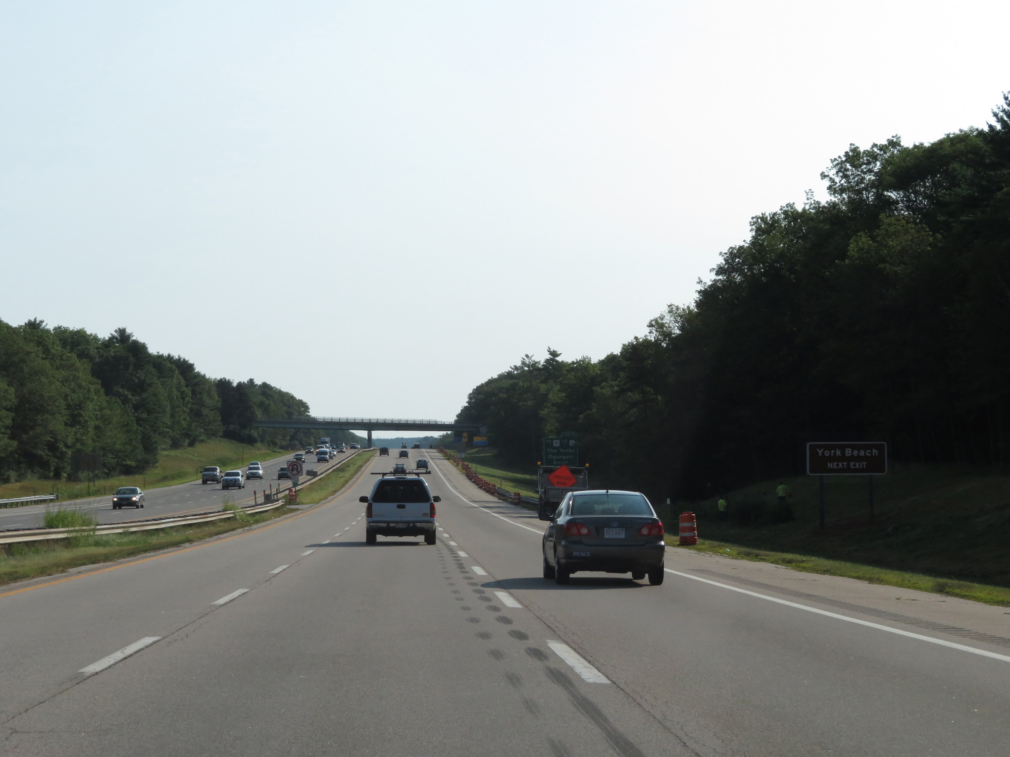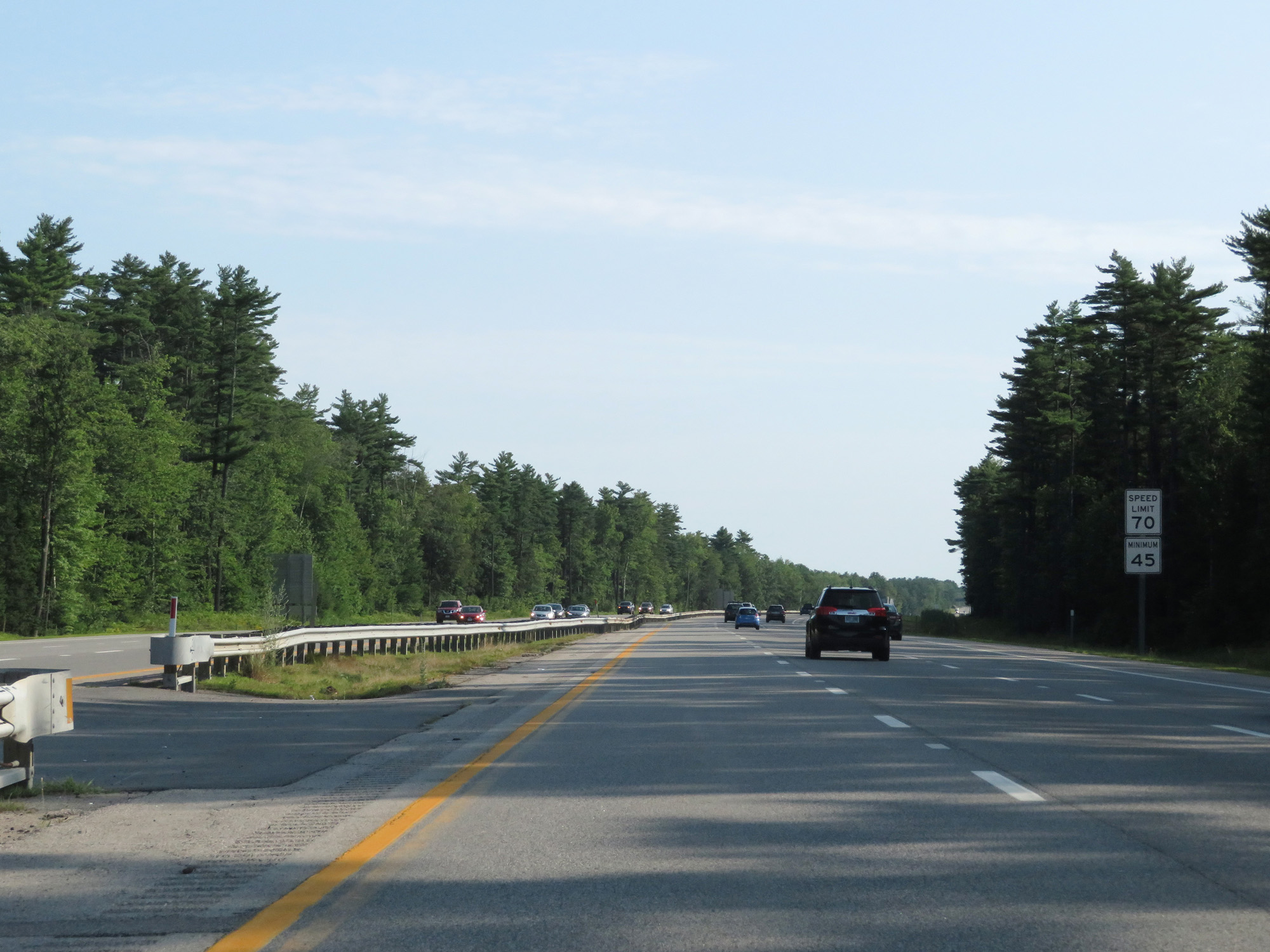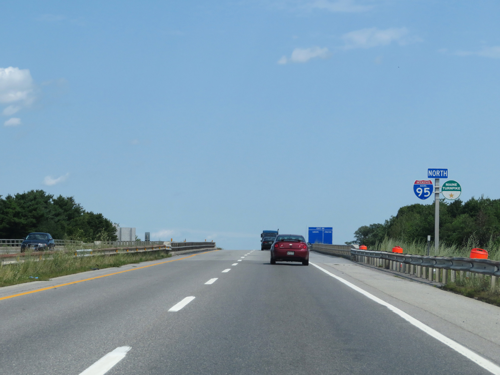 Interstate 95 North (Maine Turnpike) at mile marker 103, as traffic from Interstate 295 North merges on the right. (Photo taken 8/7/17). |