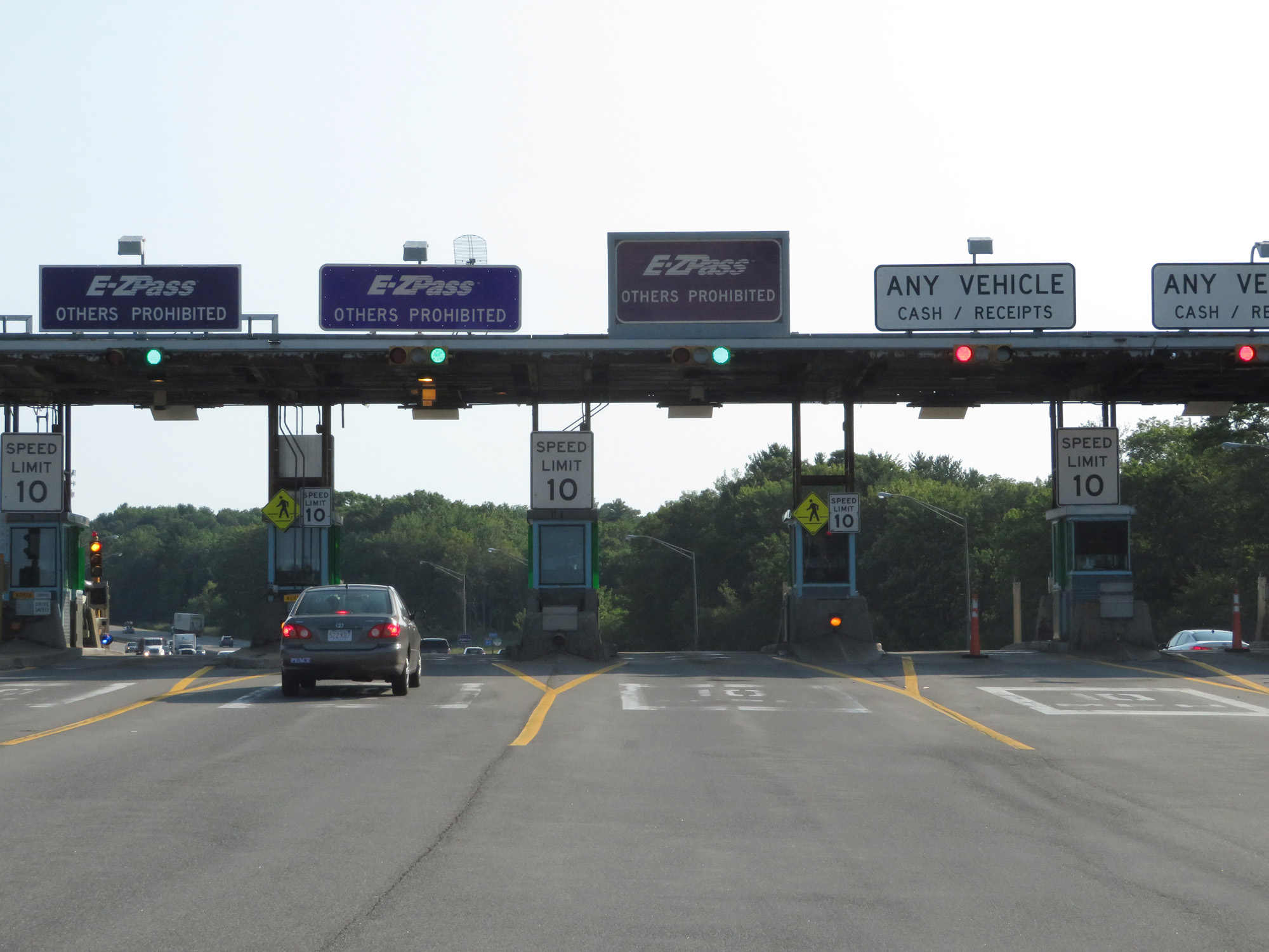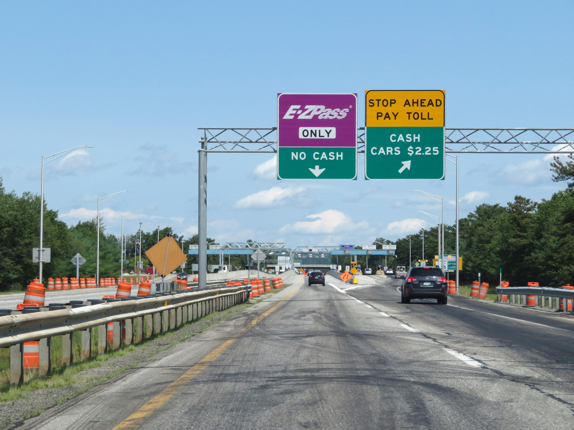 View of the ramp to the West Gardiner Toll Plaza for cash customers and wide loads. EZ Pass is accepted in all lanes. (Photo taken 8/7/17). |