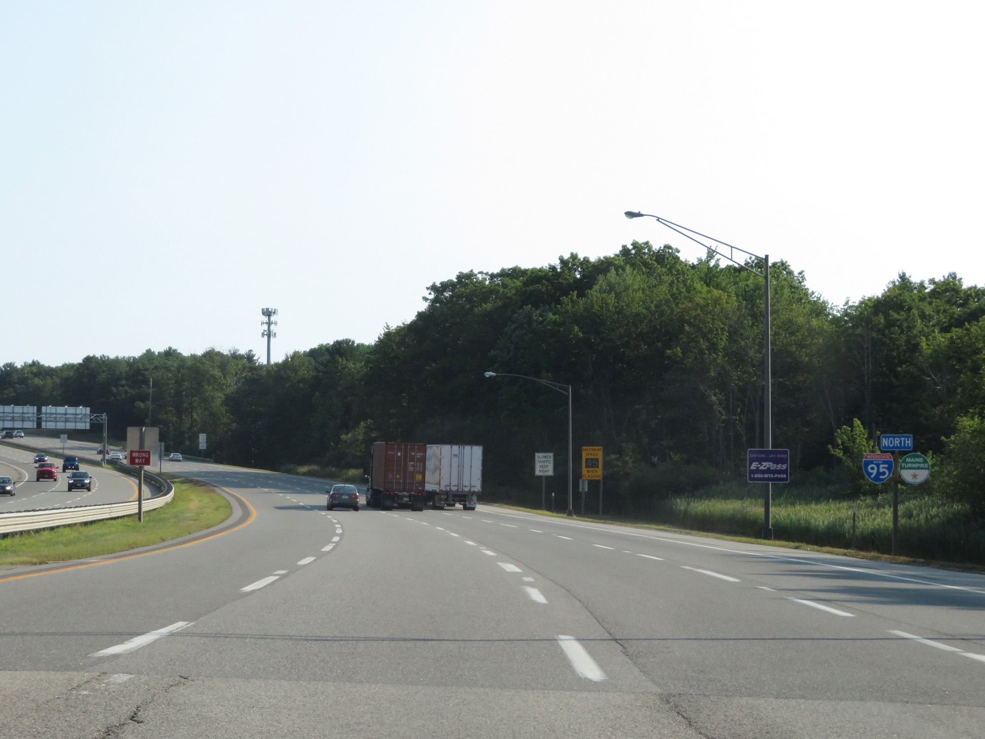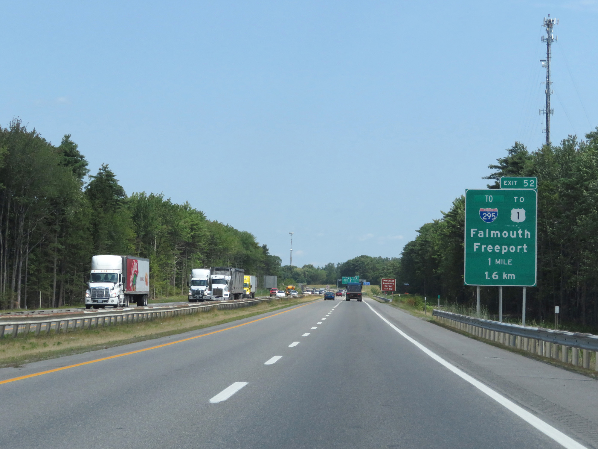 Interstate 95 North (Maine Turnpike) at Exit 52: Unsigned Interstate 495 / To Interstate 295 / To US 1 (Falmouth Spur) - Falmouth / Freeport (Photo taken 8/7/17). |