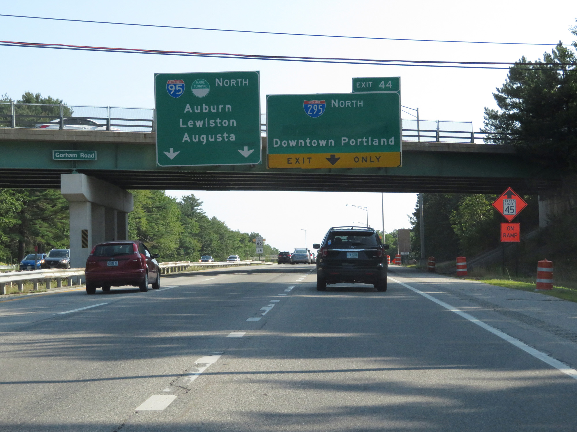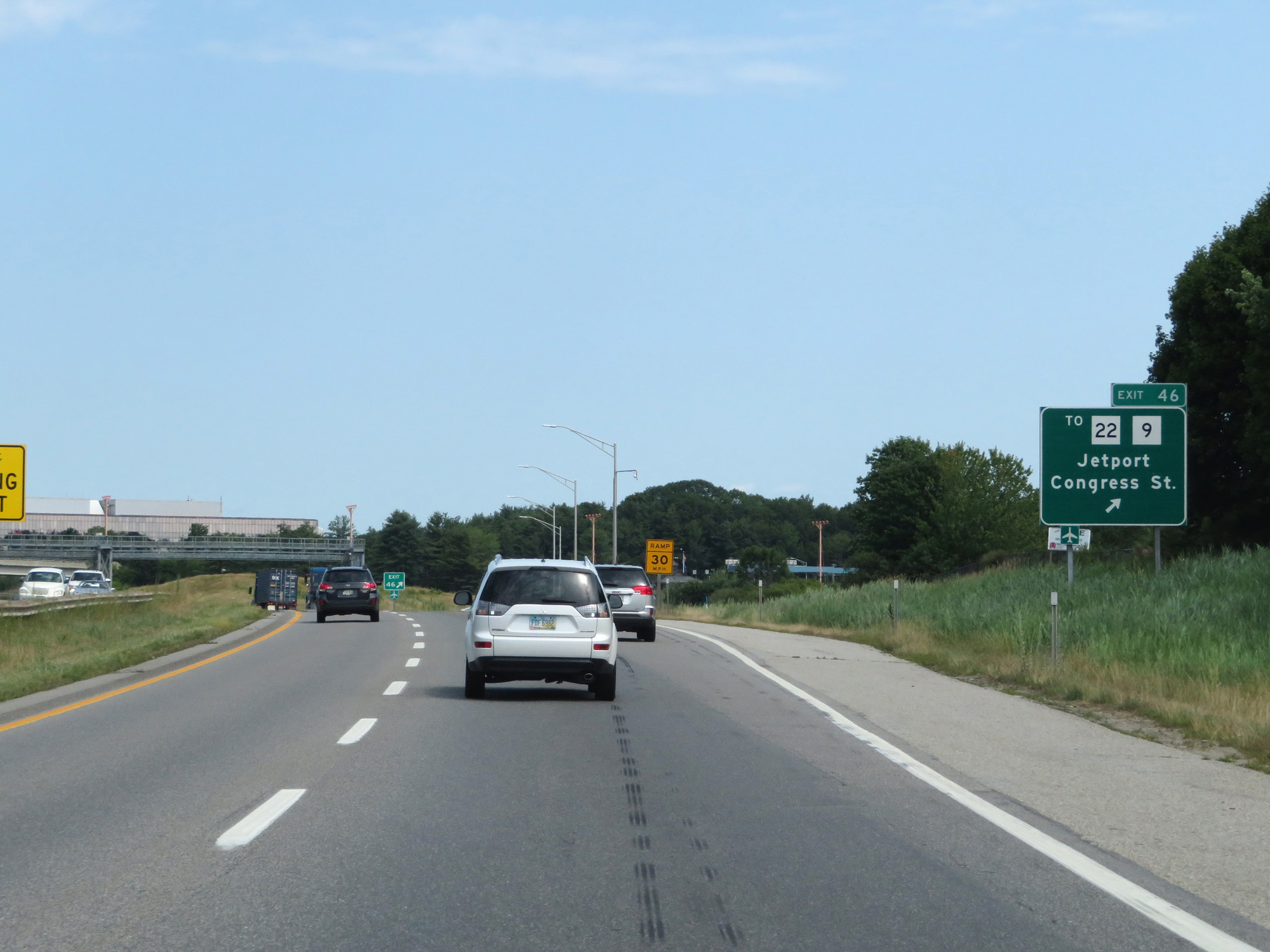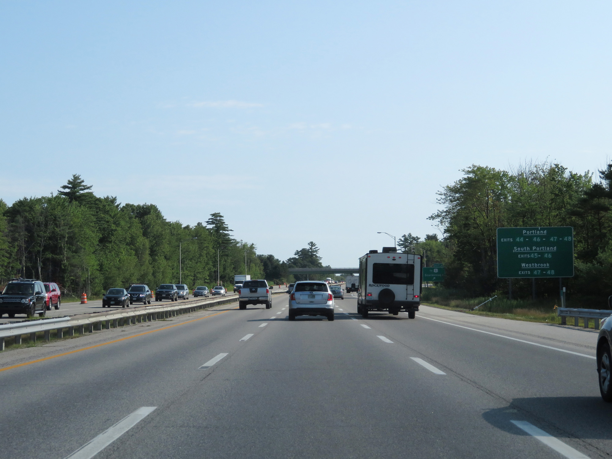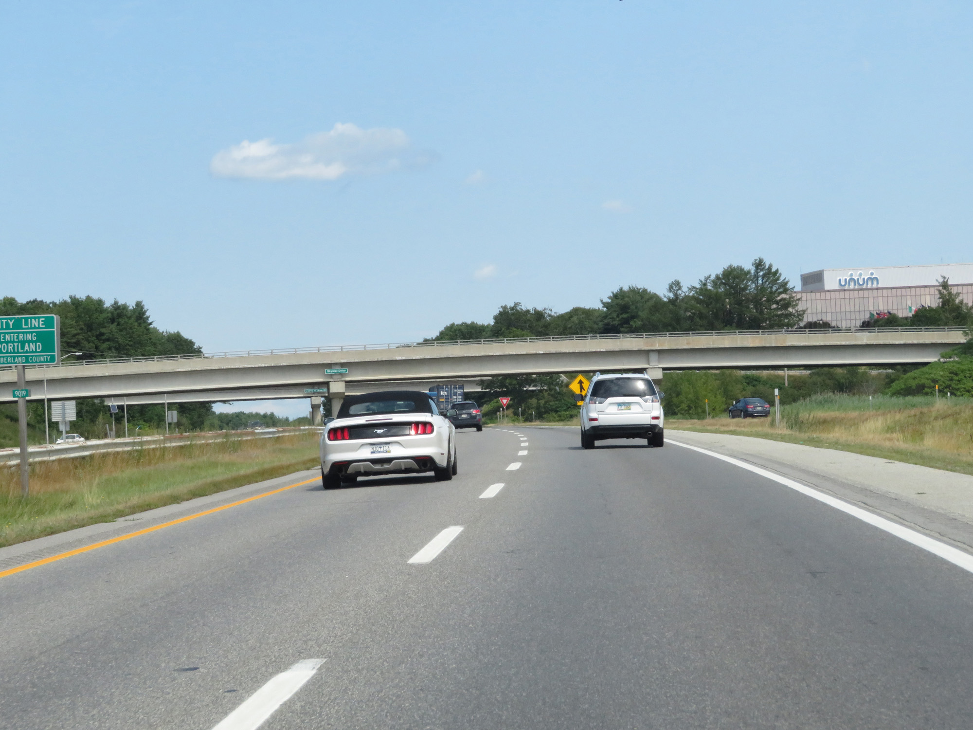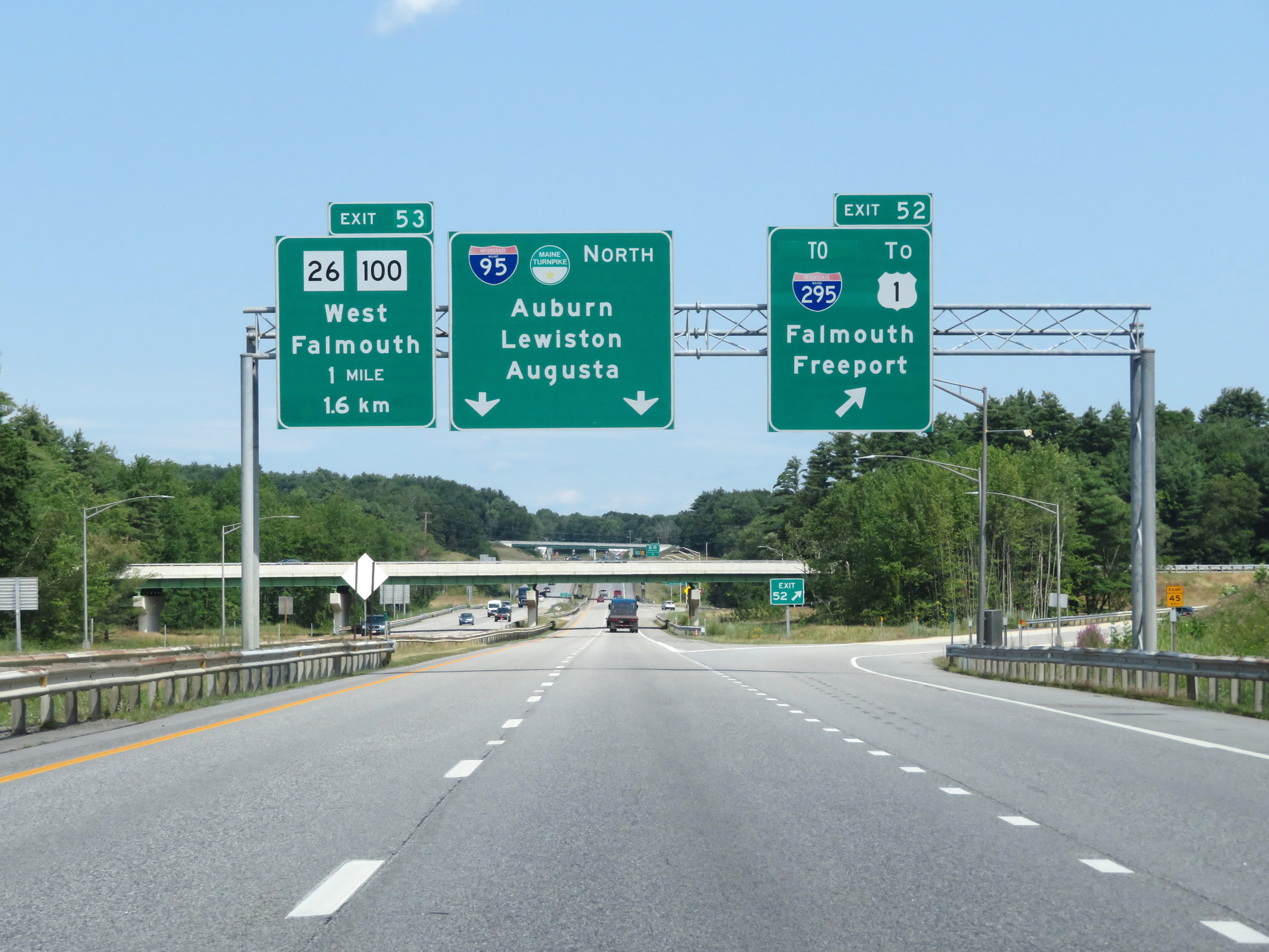 Interstate 95 North (Maine Turnpike) at Exit 53: ME 26 / ME 100 - Falmouth / Cumberland (Photo taken 8/7/17). |