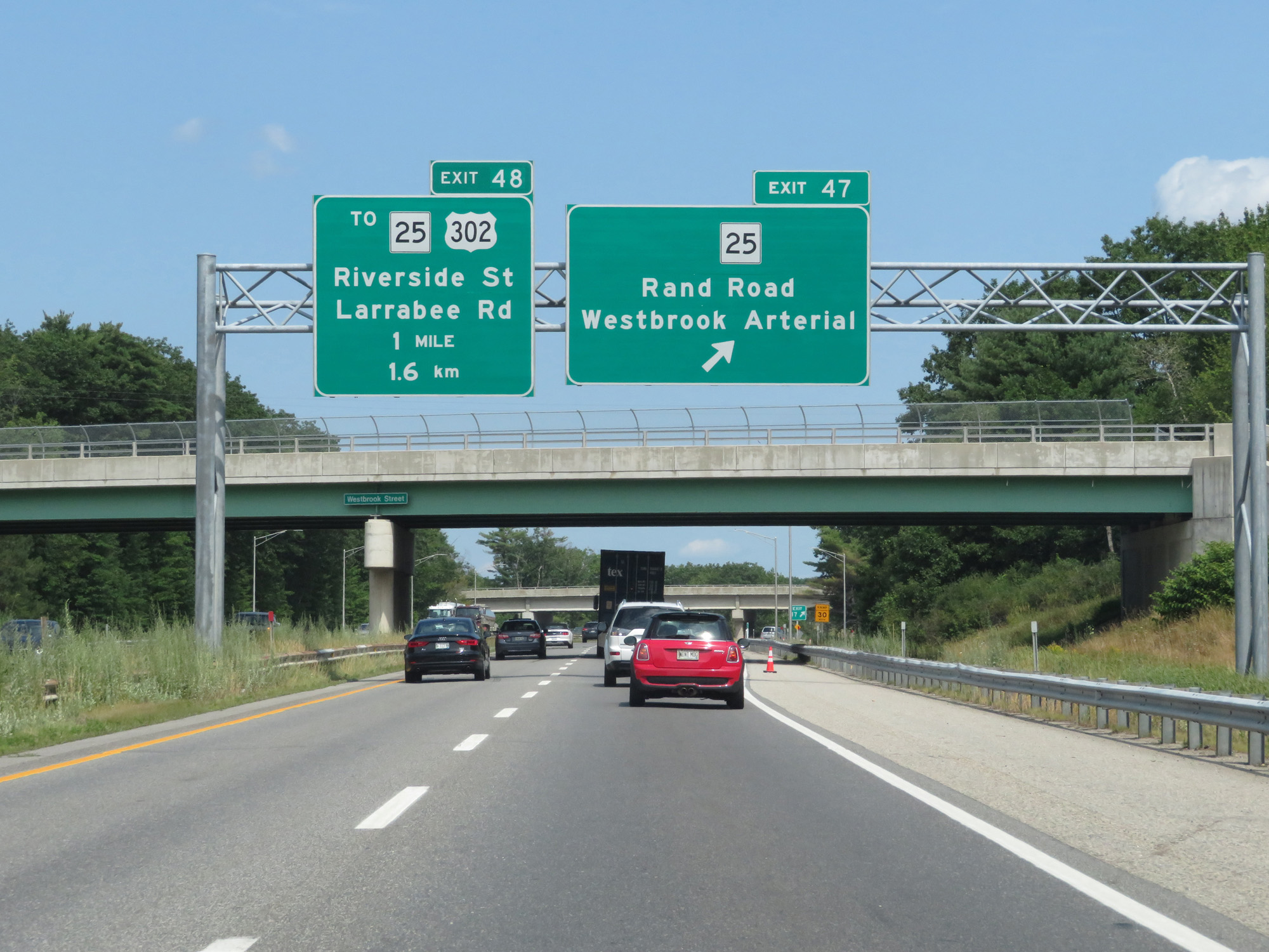 Interstate 95 North (Maine Turnpike) at Exit 48: To ME 25 / To US 302 - Riverside St / Larrabee Rd (Photo taken 8/7/17). |