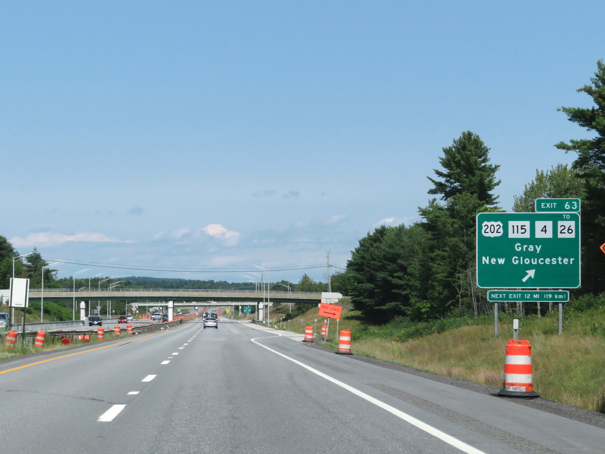 Interstate 95 North (Maine Turnpike) at Exit 63: US 202 / ME 115 / ME 4 / To ME 26 - Gray / New Gloucester (Photo taken 8/7/17). |