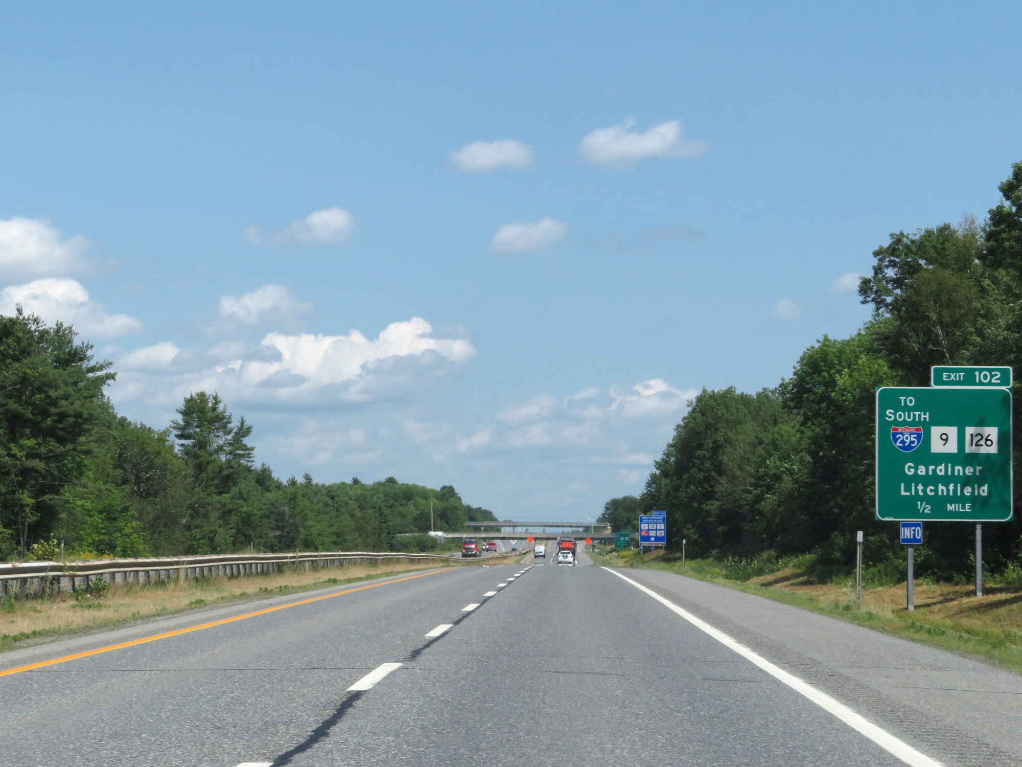 Interstate 95 North (Maine Turnpike) at Exit 102: ME 9 / ME 126 / To Interstate 295 South - Gardiner / Litchfield (Photo taken 8/7/17). |