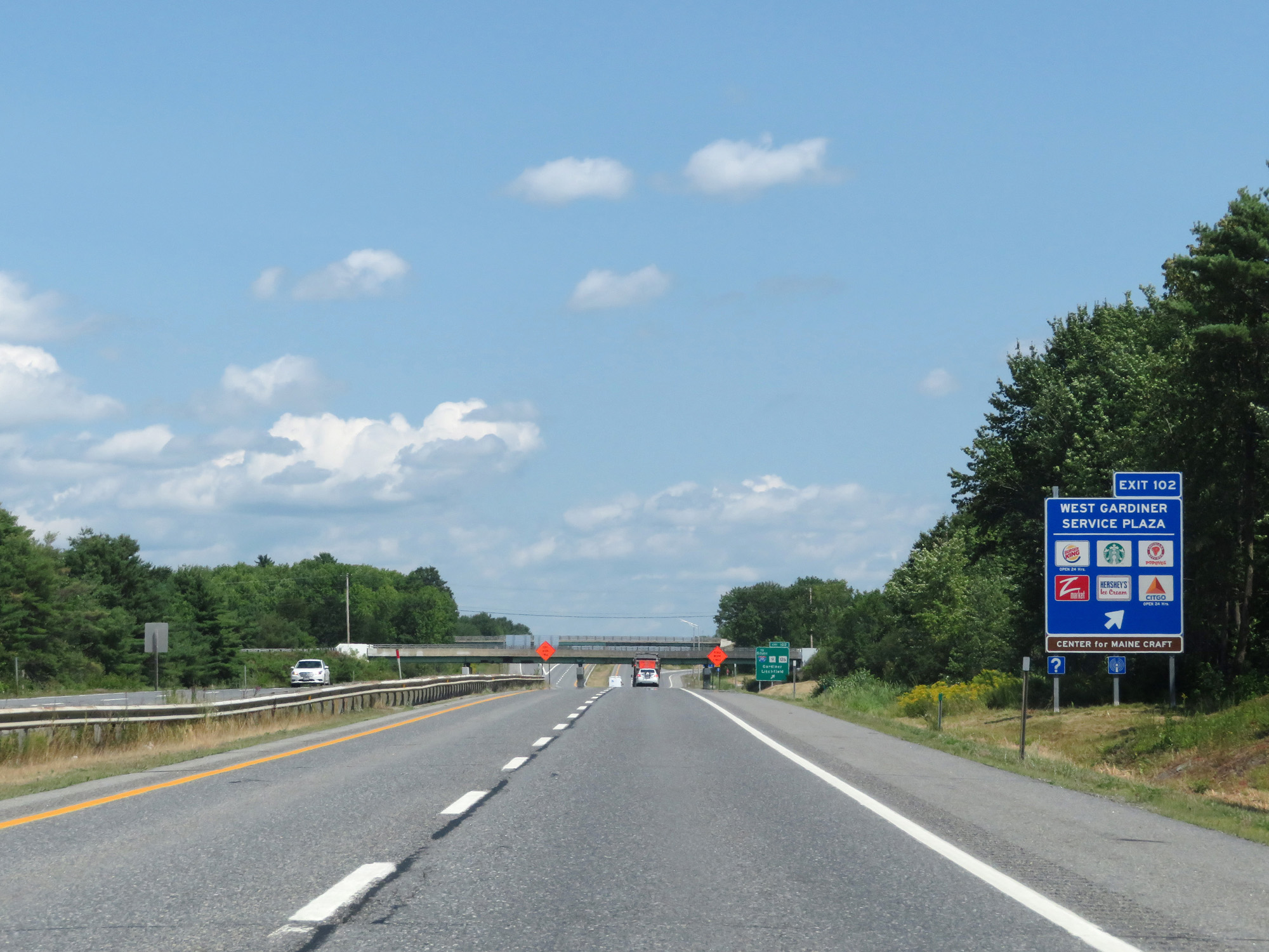 To access the West Gardiner Service Plaza, the final northbound service plaza on the Maine Turnpike, you must use Exit 102. (Photo taken 8/7/17). |