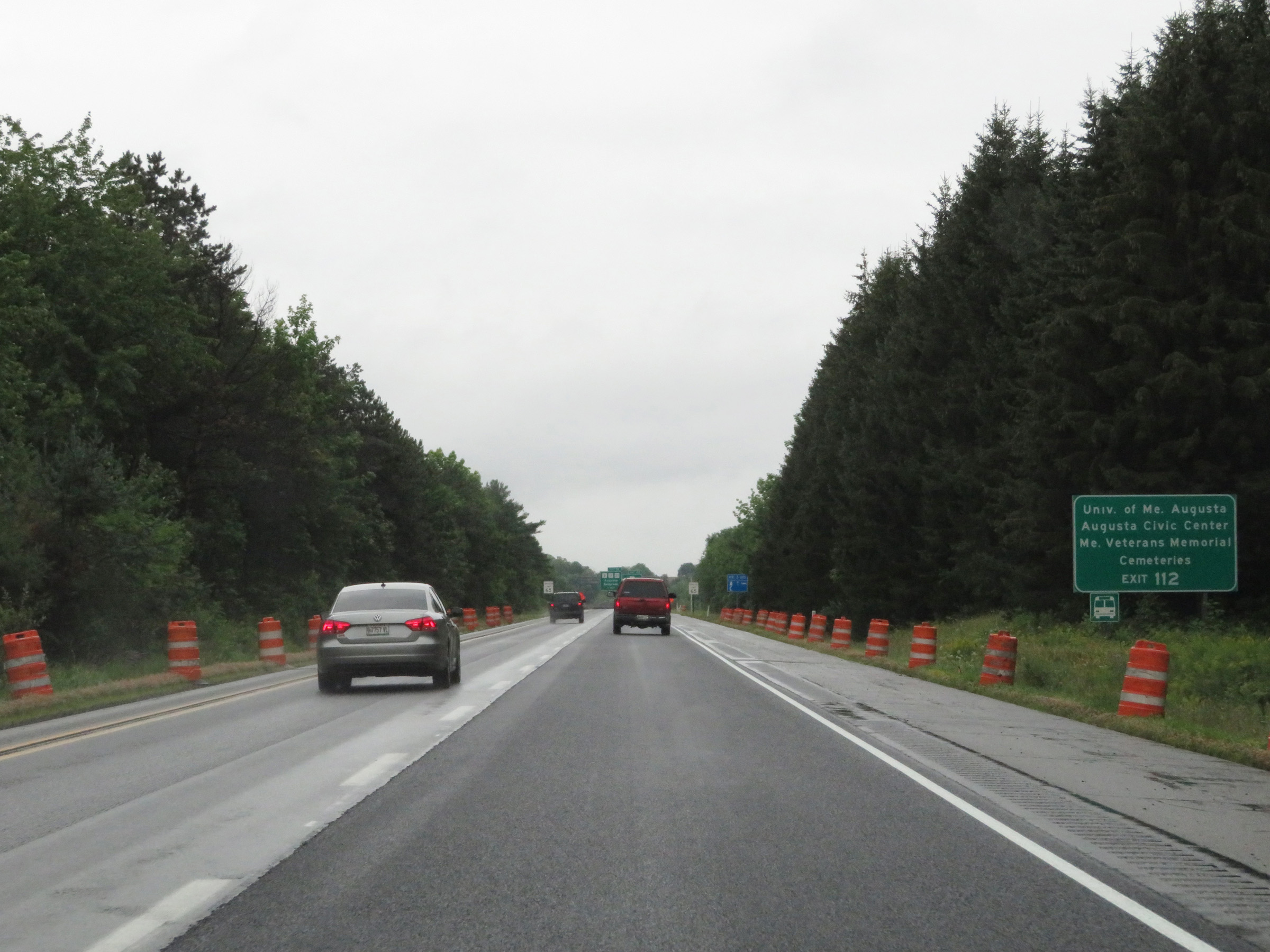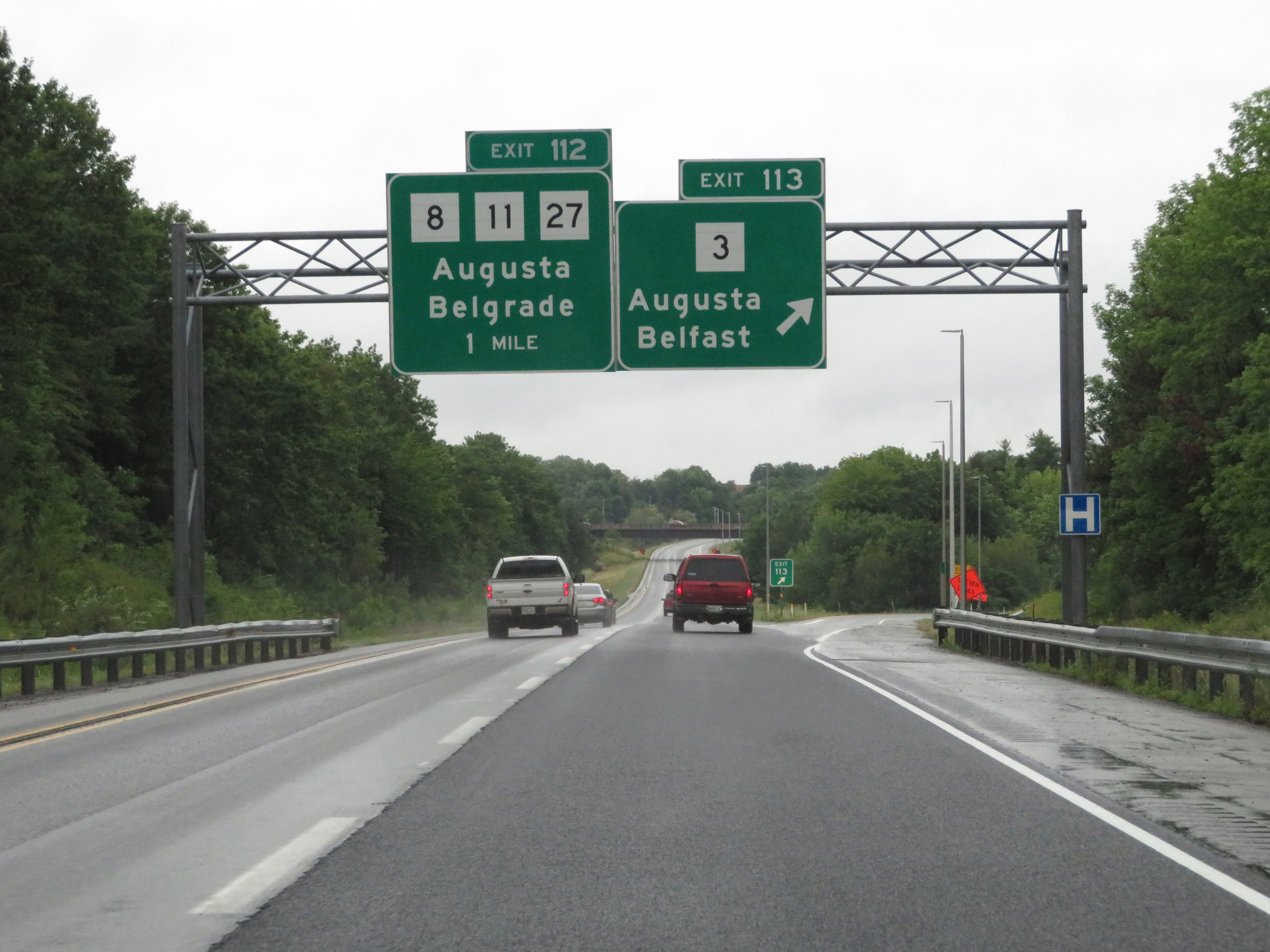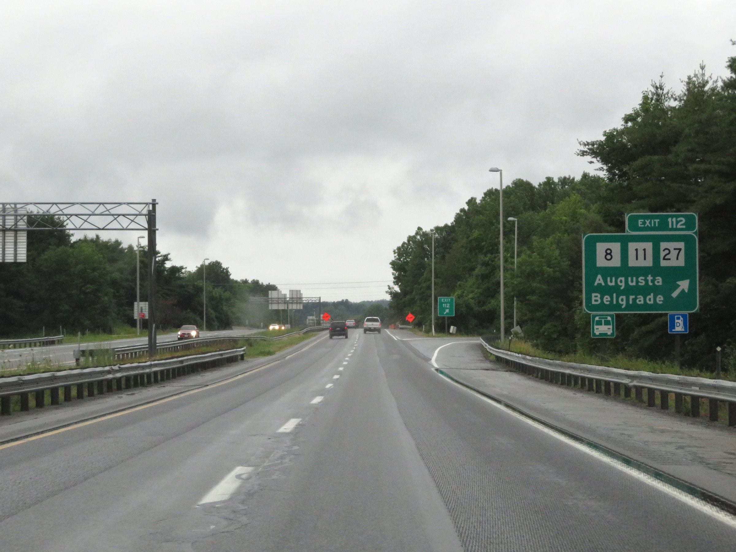 Interstate 95 South at Exit 112: ME 8 / ME 11 / ME 27 - Augusta / Belgrade (Photo taken 8/8/17). |