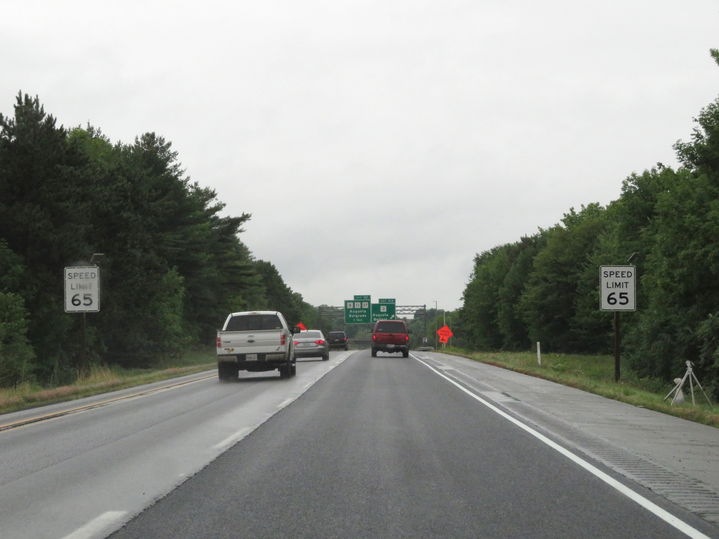 Approaching Exit 113, the speed limit decreases to 65 mph as Interstate 95 South enters the Augusta area. (Photo taken 8/8/17). |