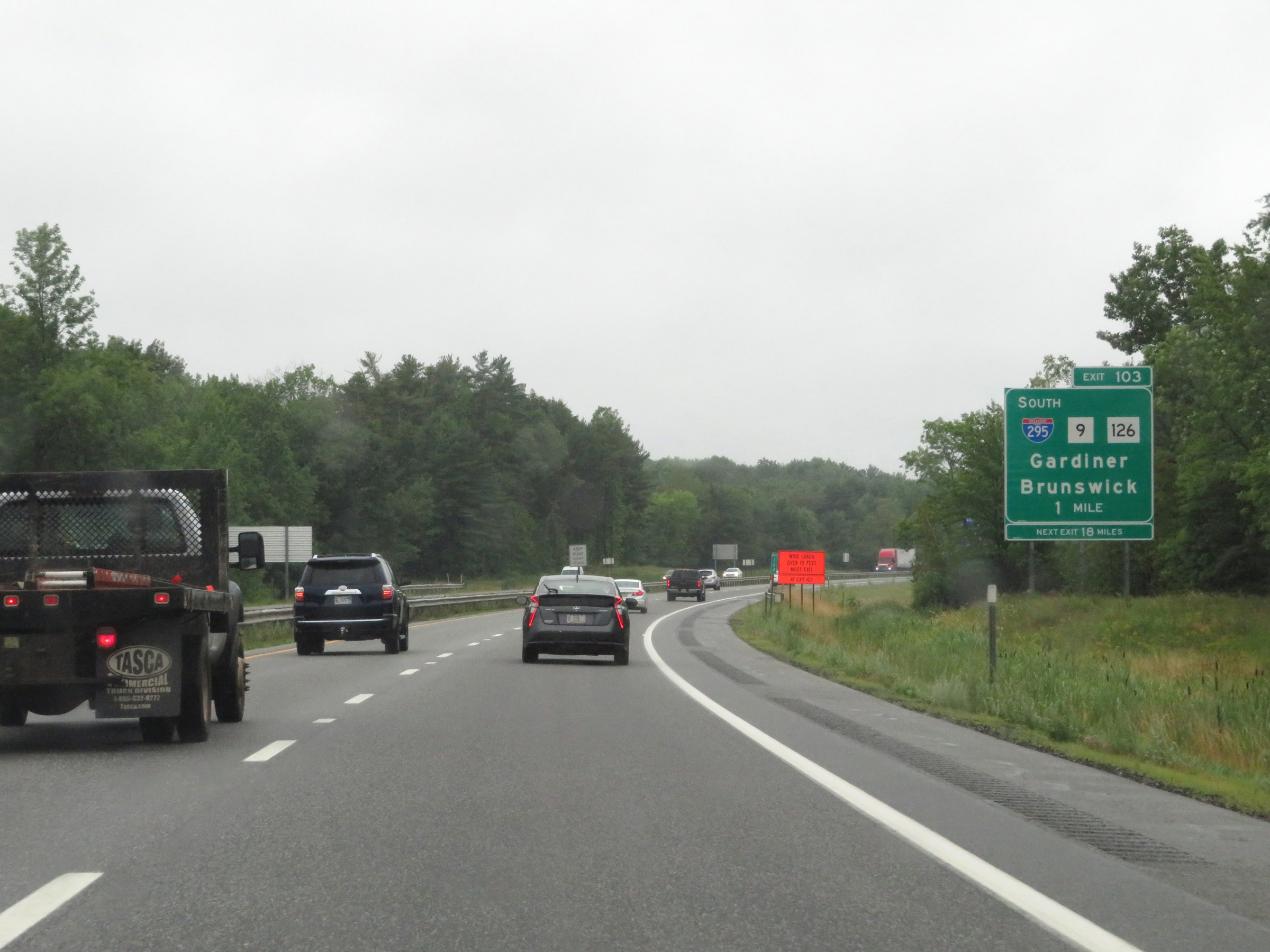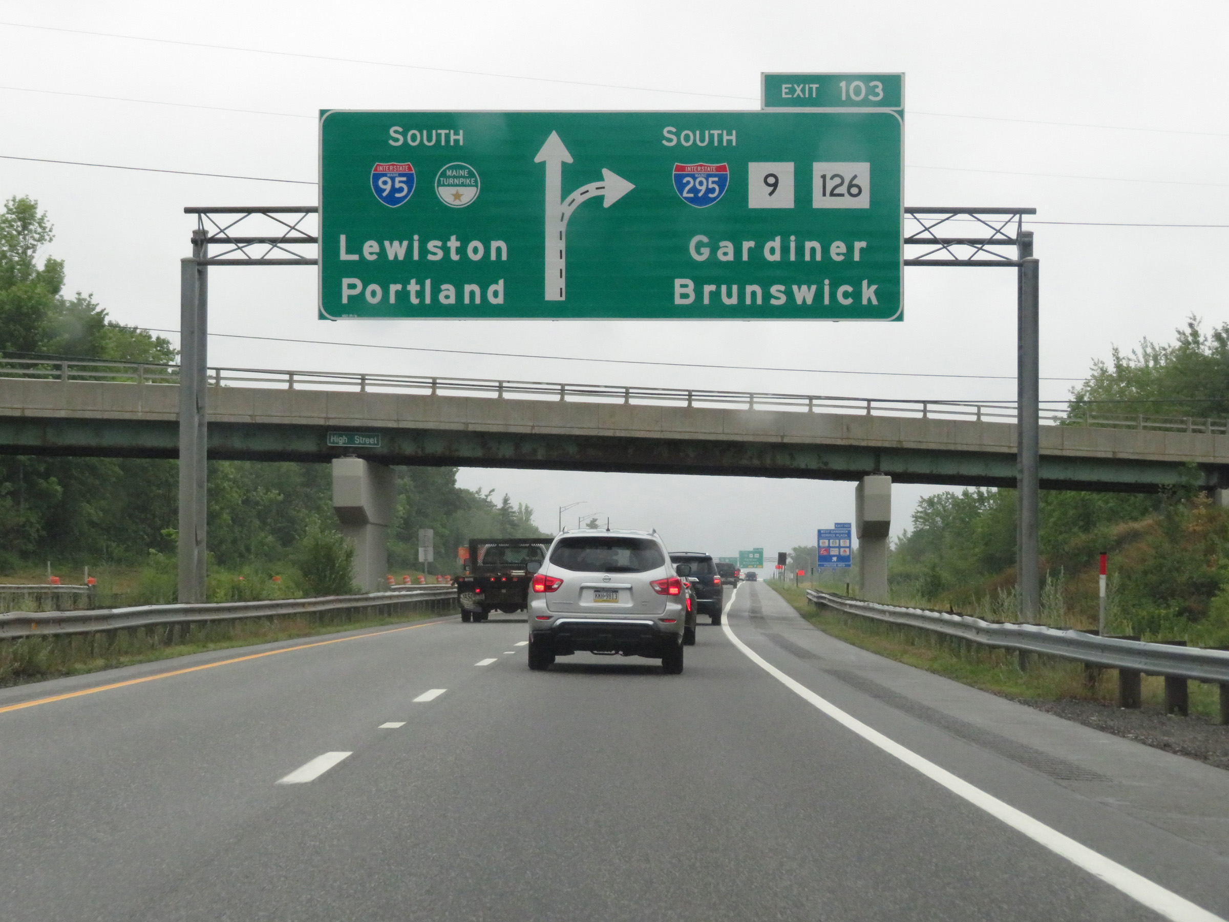 Interstate 95 South (Maine Turnpike) at Exit 103: Interstate 295 South / ME 9 / ME 126 - Gardiner / Brunswick (Photo taken 8/8/17). |