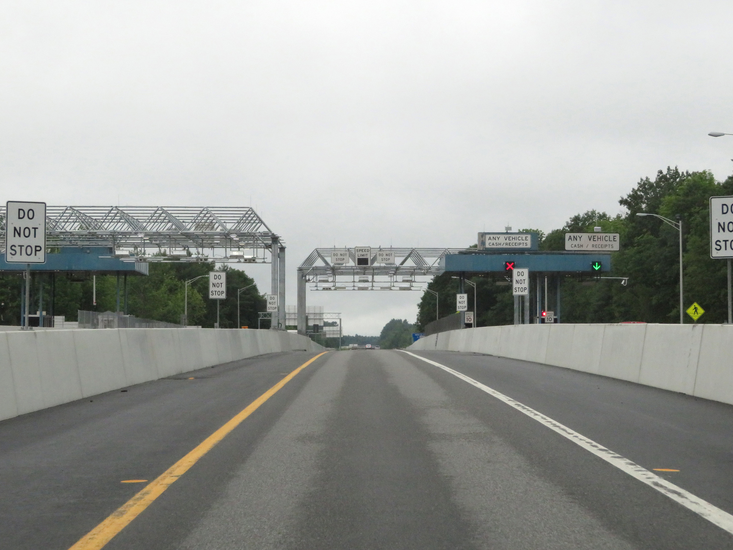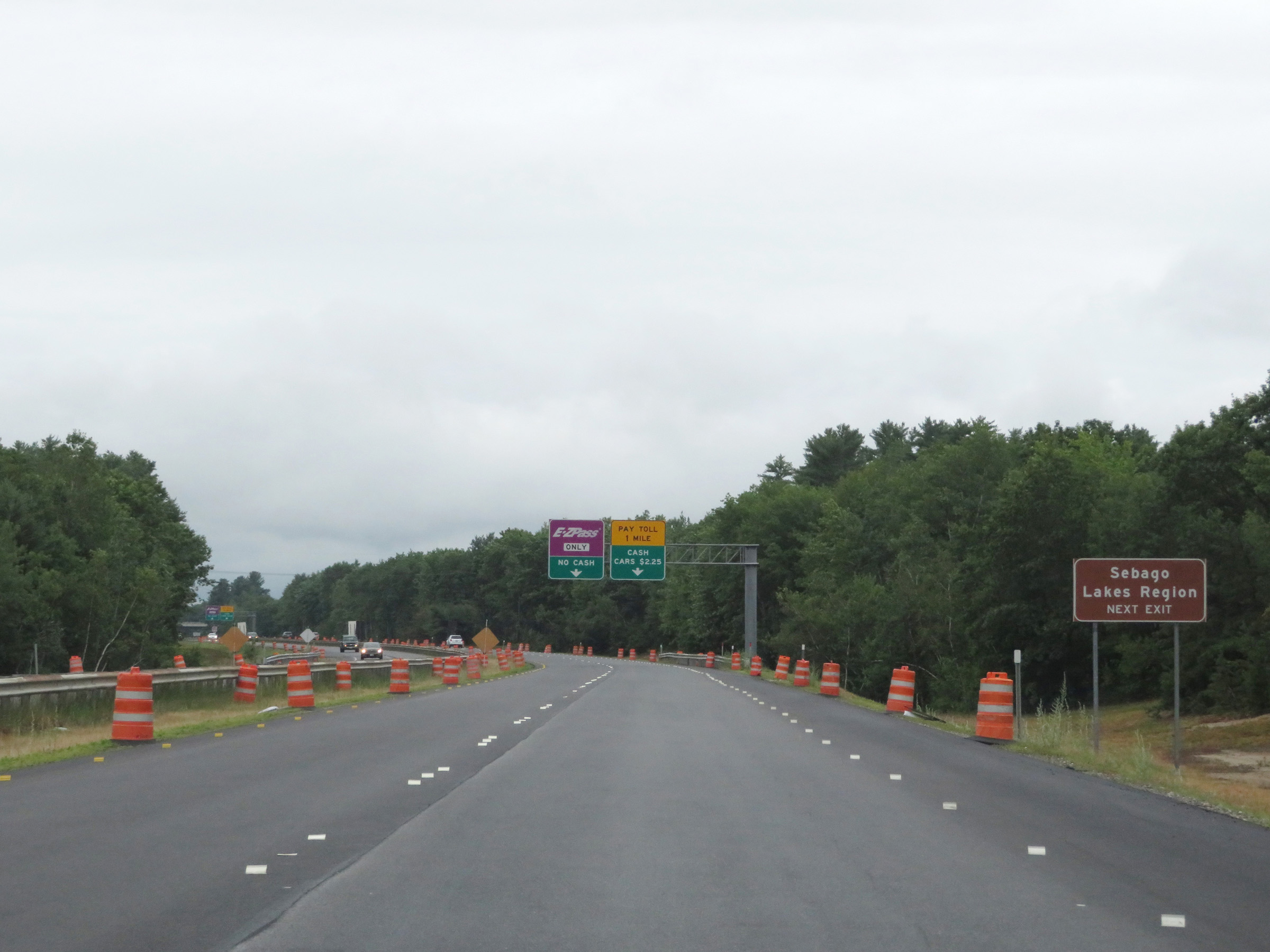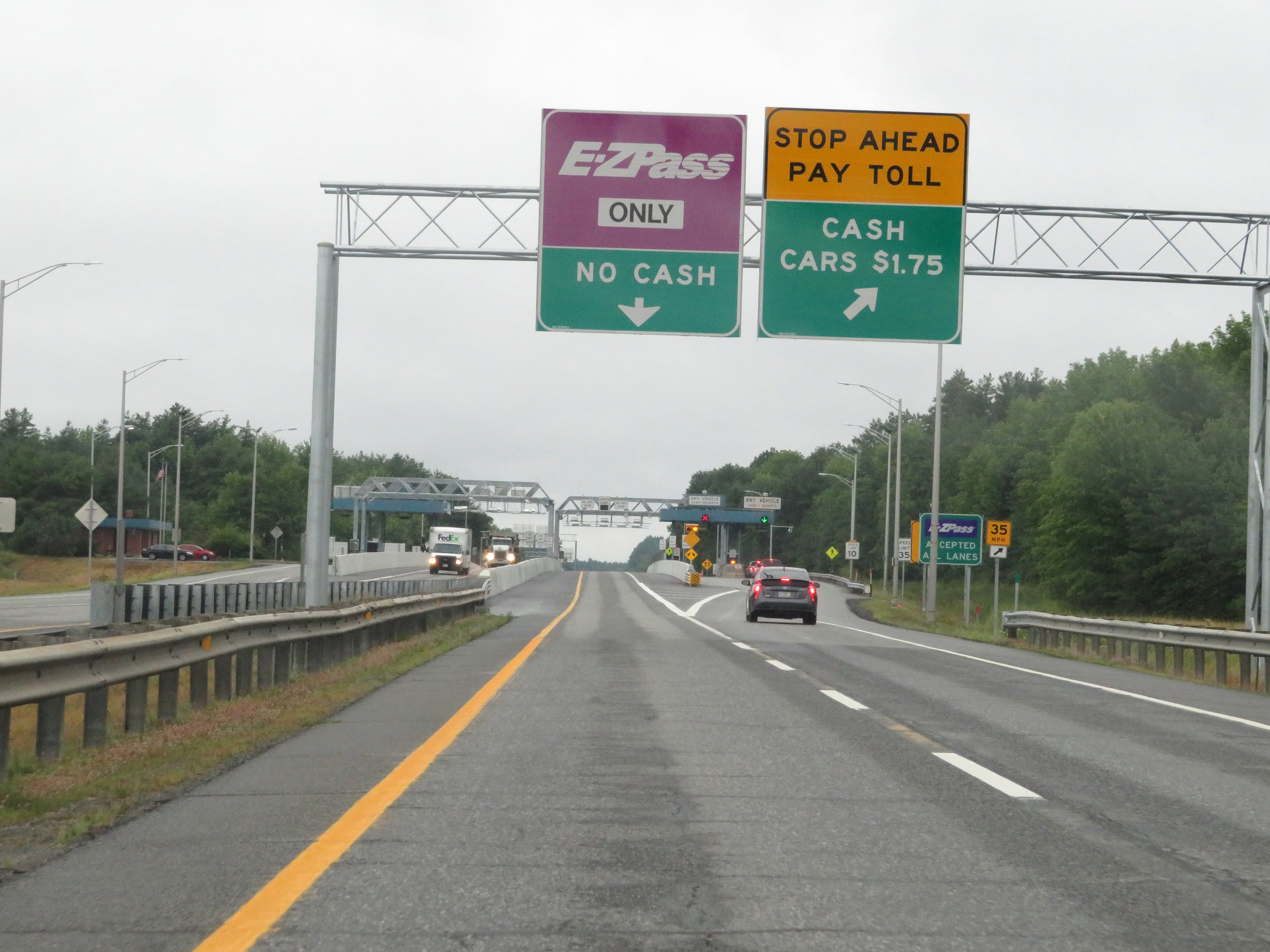 Interstate 95 South (Maine Turnpike) as its two lanes split into EZ Pass and cash lanes at the West Gardiner Toll Plaza. (Photo taken 8/8/17). |