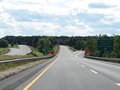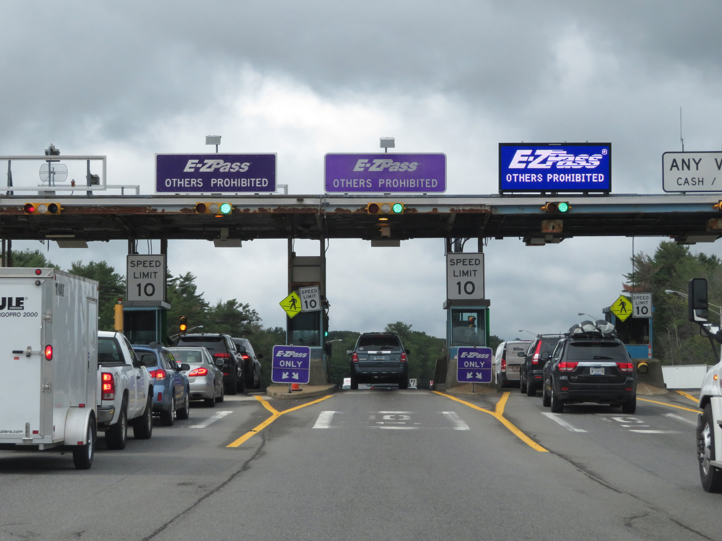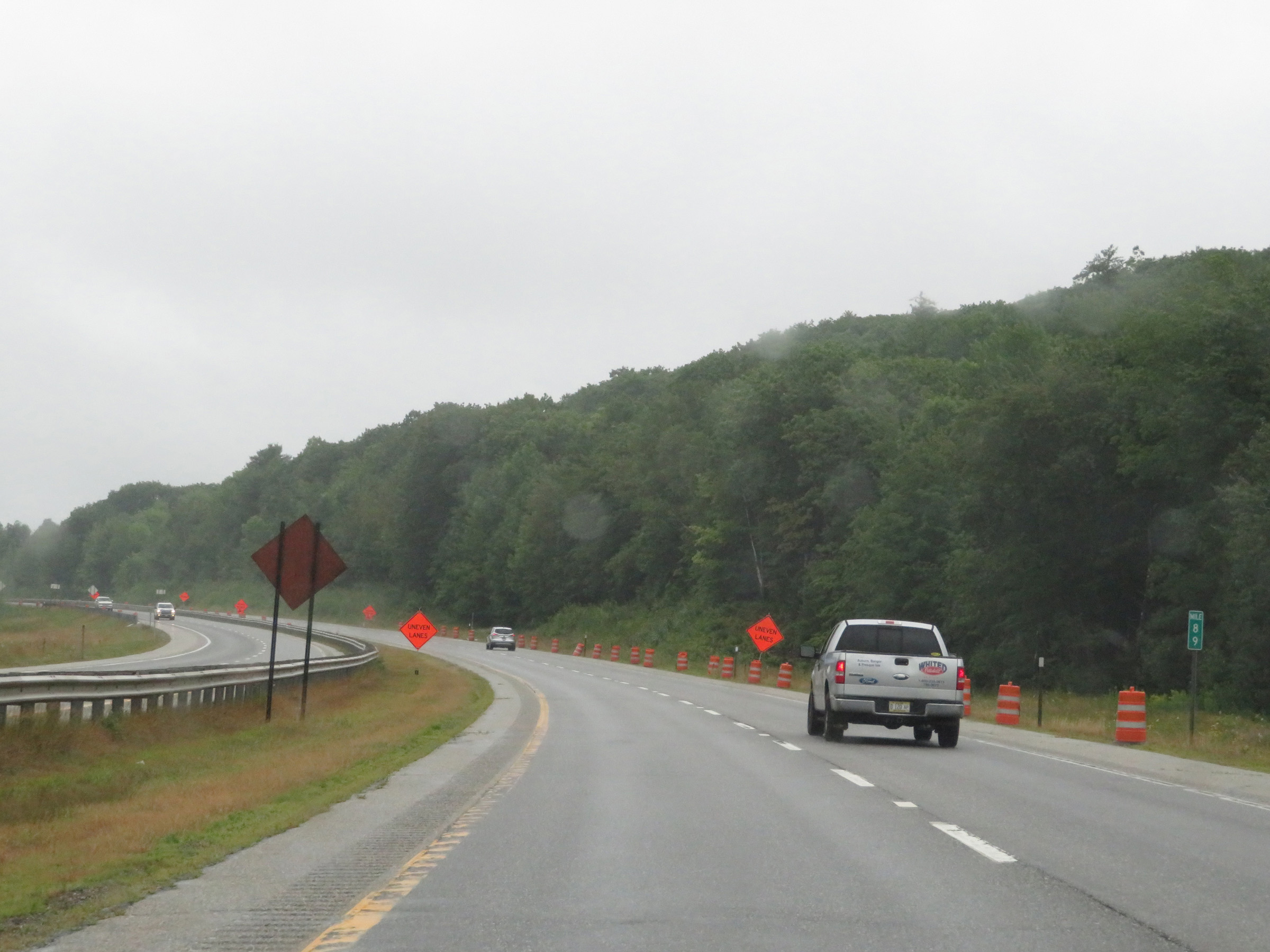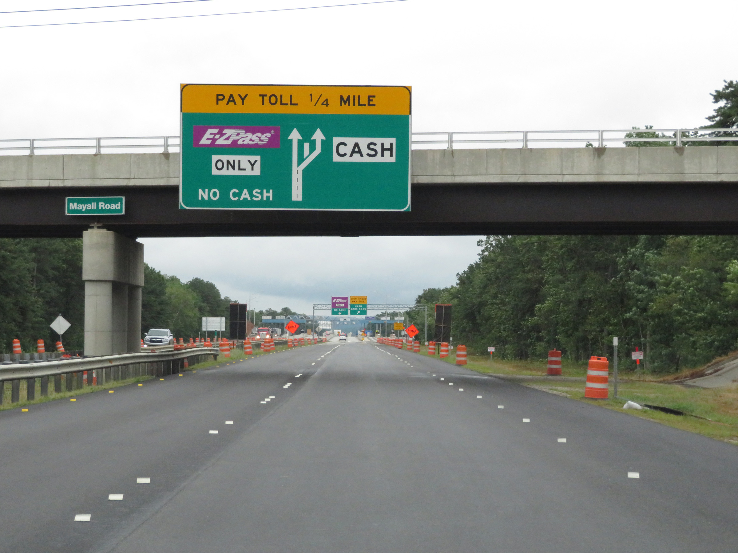 Interstate 95 South (Maine Turnpike) as its two lanes split into EZ Pass and cash lanes at the West Gardiner Toll Plaza. (Photo taken 8/8/17). |