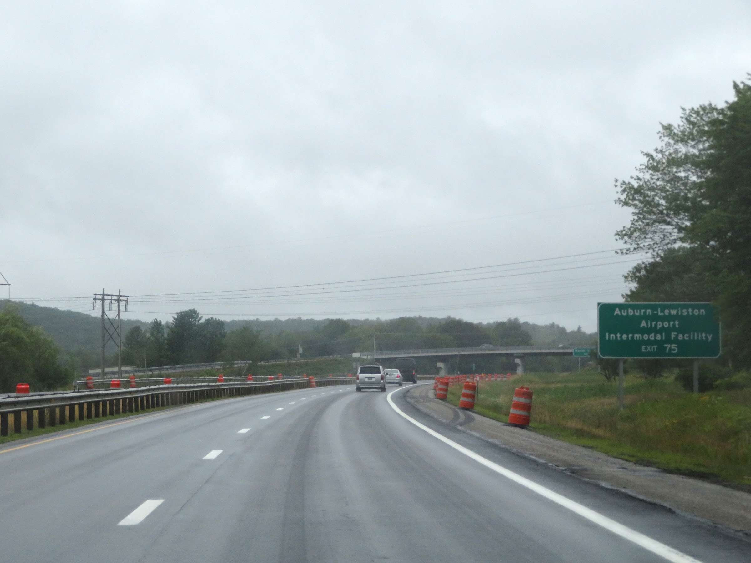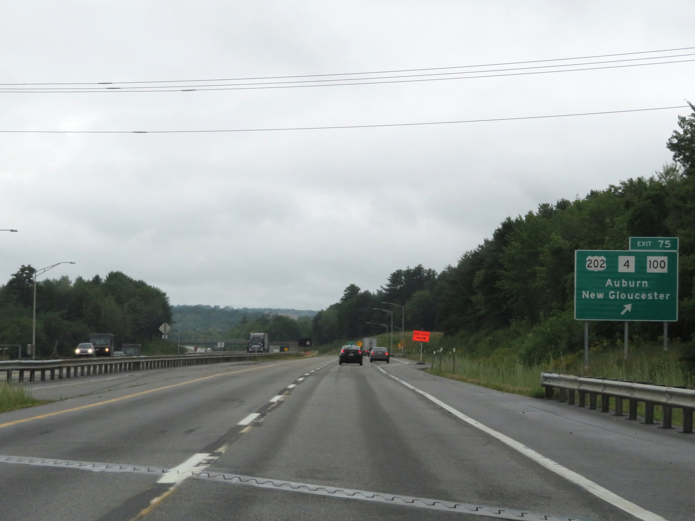 Interstate 95 South (Maine Turnpike) at Exit 75: US 202 / ME 4 / ME 100 - Auburn / New Gloucester (Photo taken 8/8/17). |