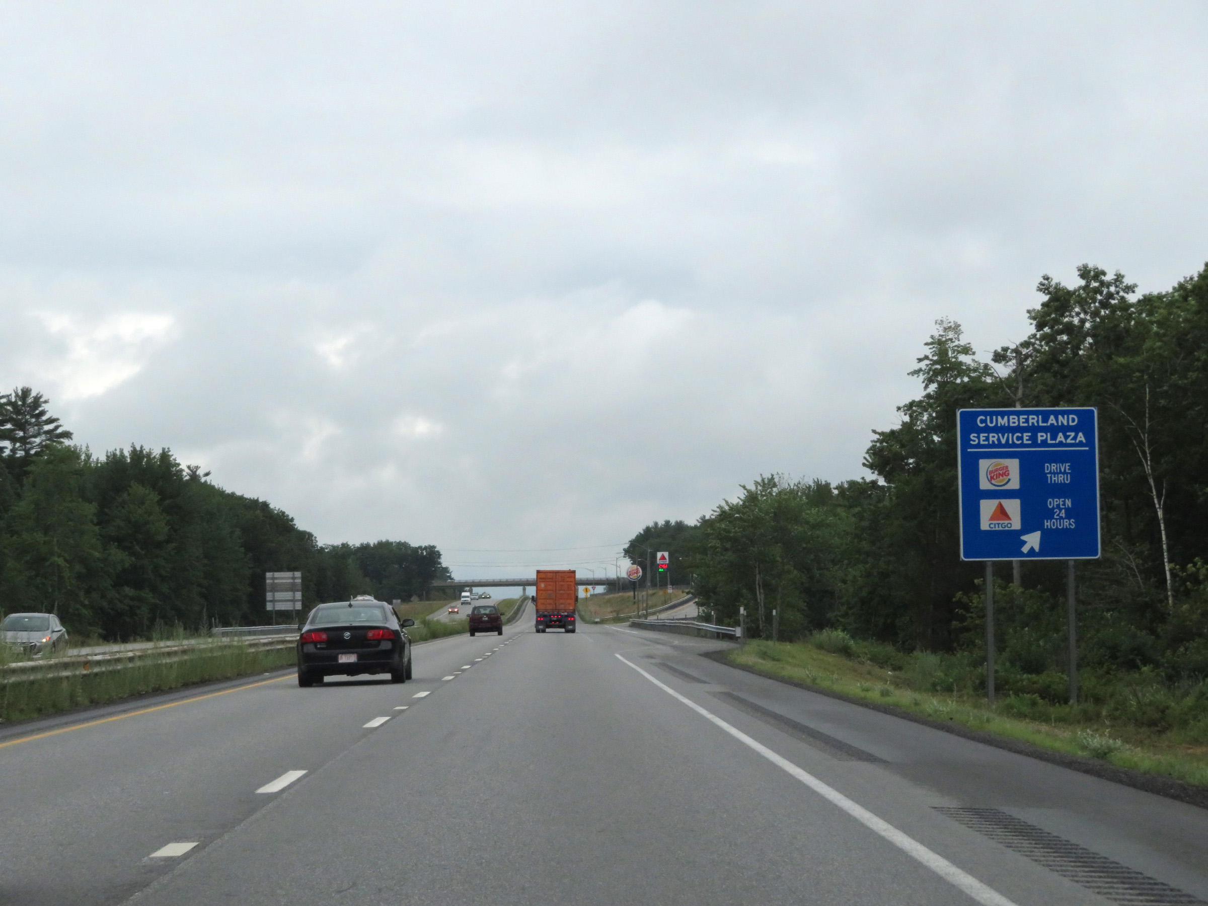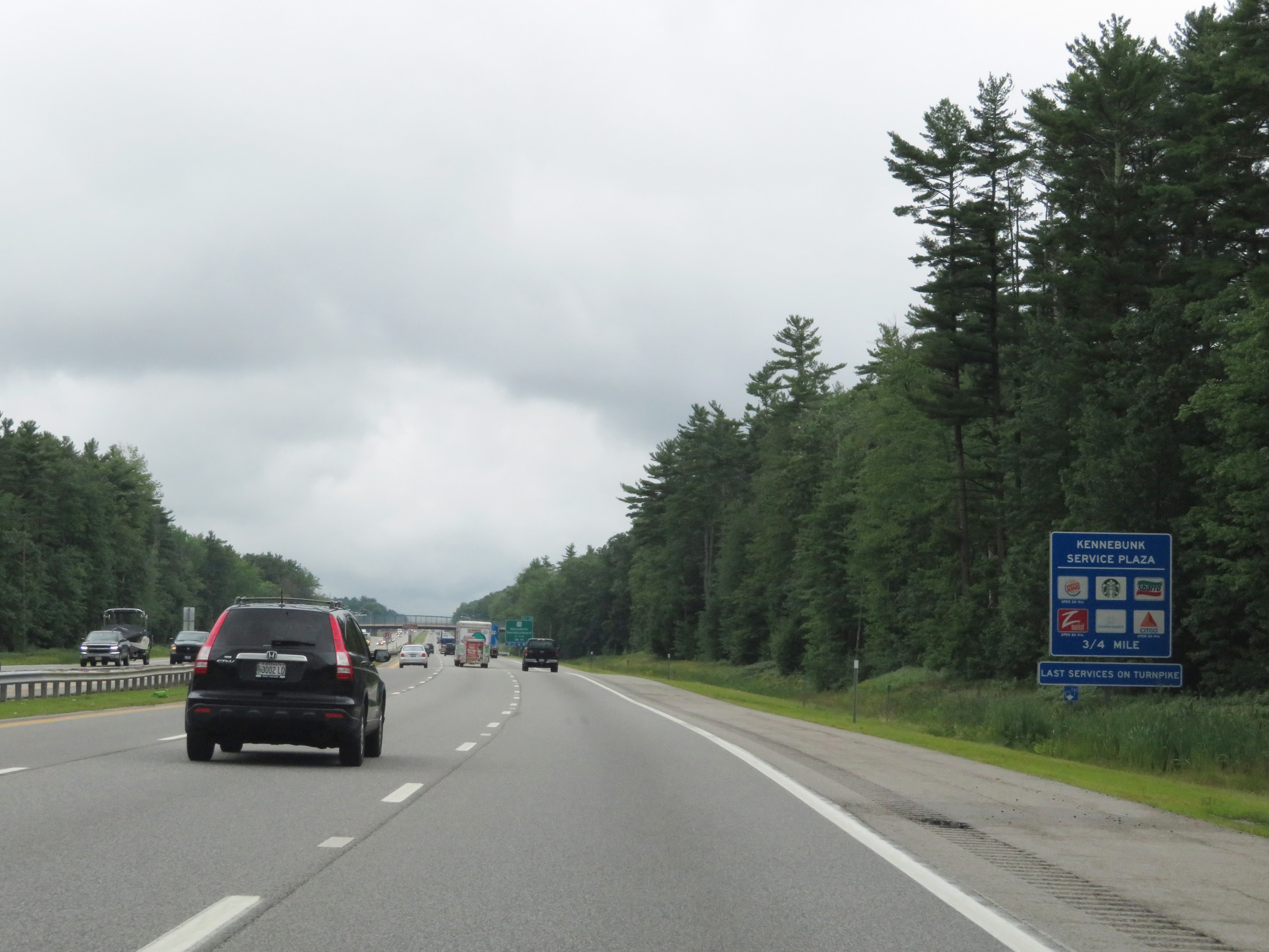 There are three service plazas on the Maine Turnpike portion of Interstate 95 South, and this sign lists the distances to each of them from this point. (Photo taken 8/8/17). |