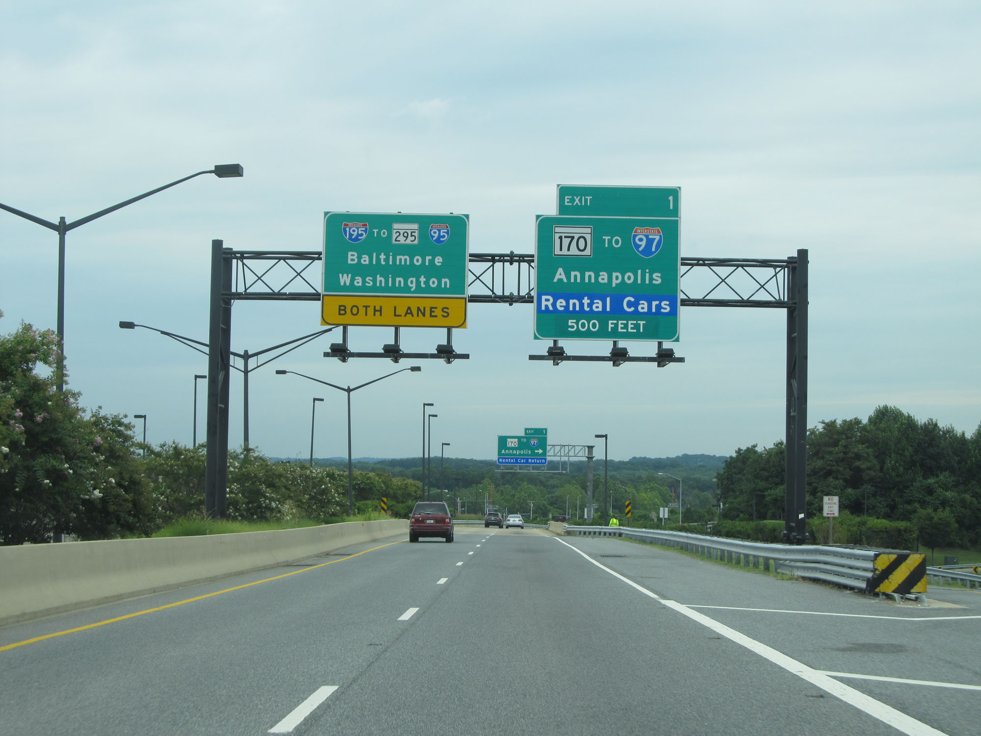 Interstate 195 West at Exit 1: MD 170 / To Interstate 97 - Annapolis / Rental Car Return (Photo taken 8/7/15). |