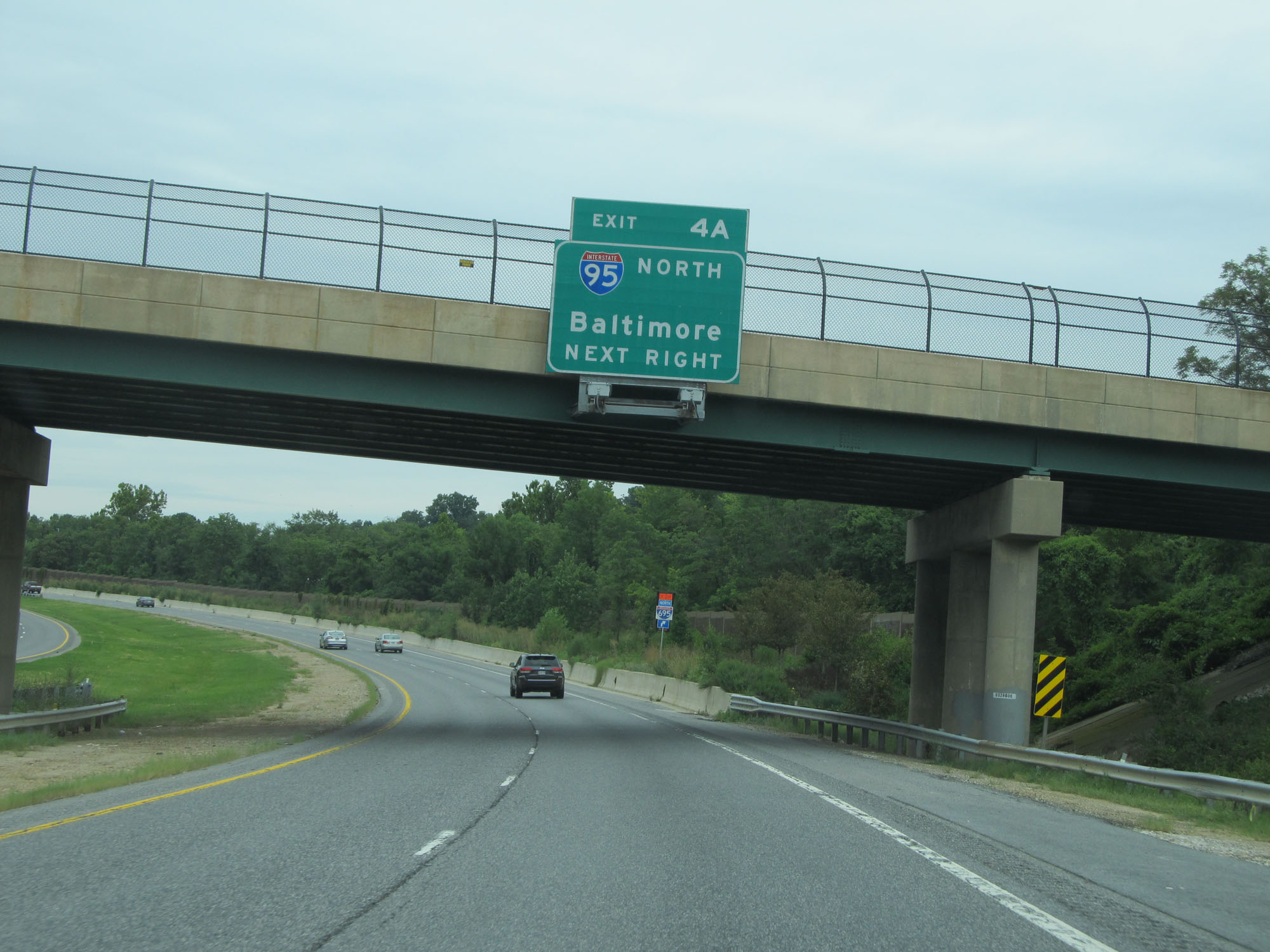 Traffic to Interstate 70 and Interstate 83 should use Interstate 95 North via Exit 4A, 2 miles ahead. (Photo taken 8/7/15). |