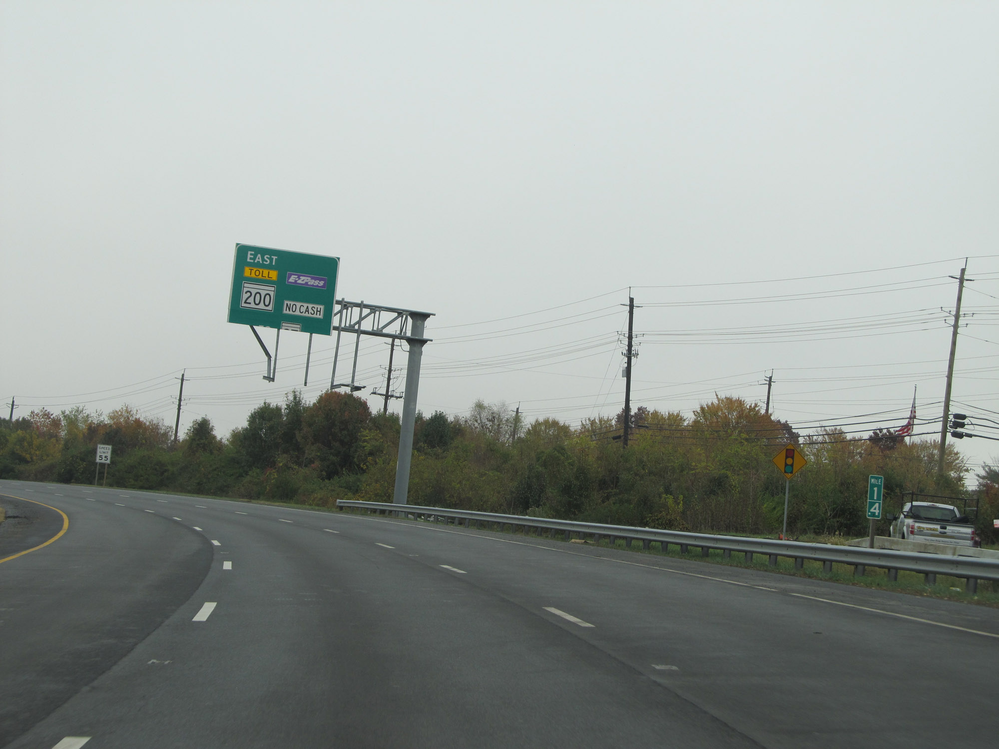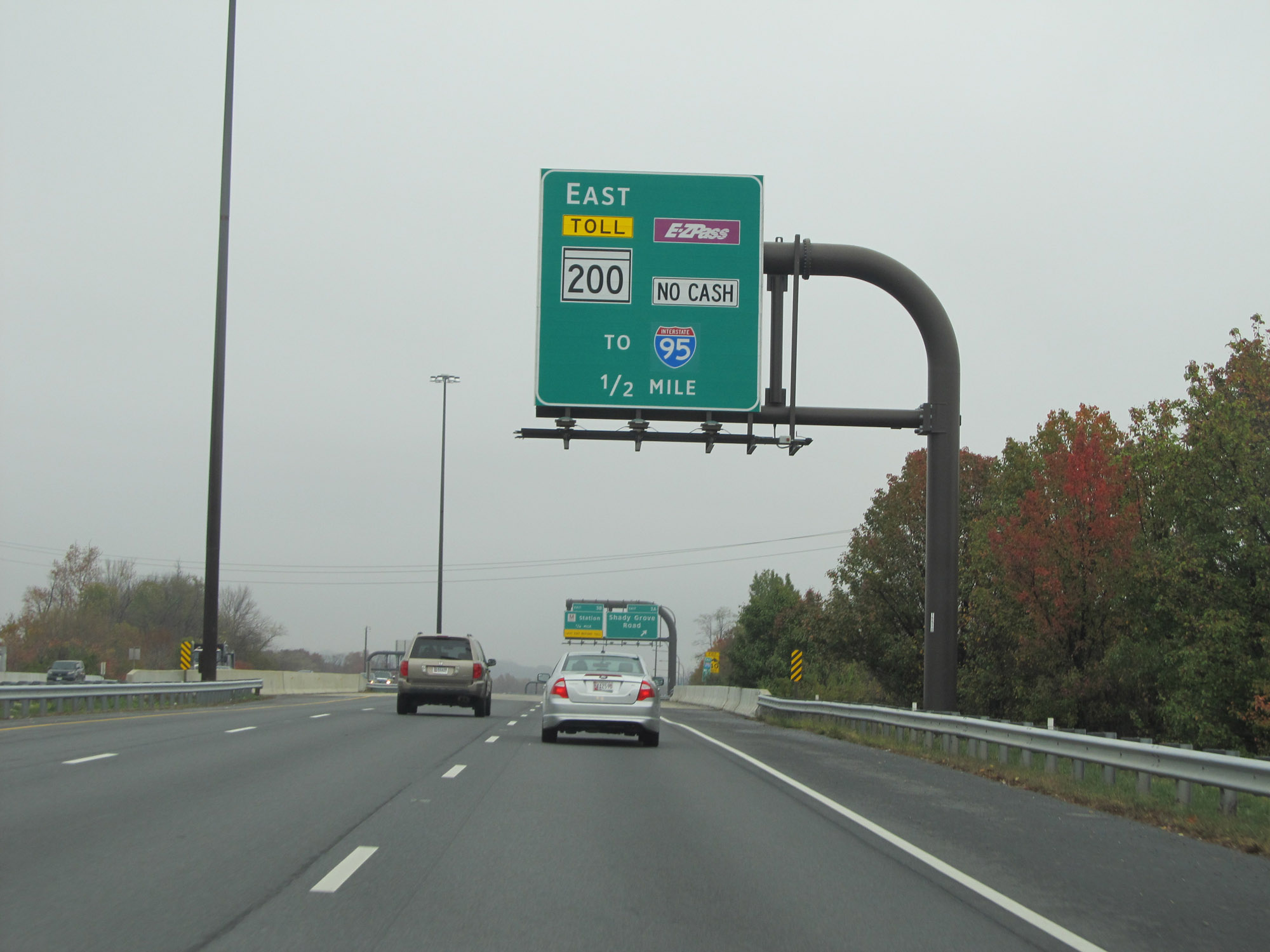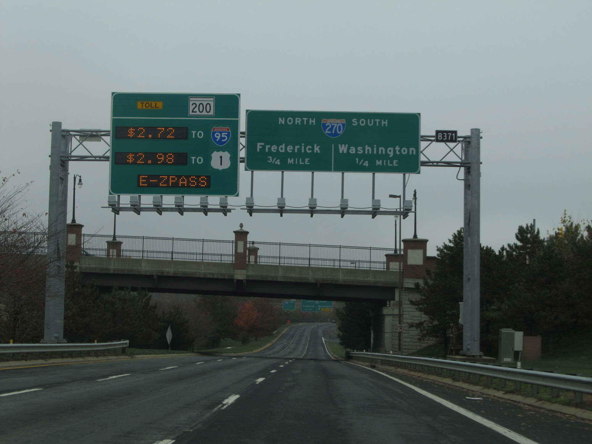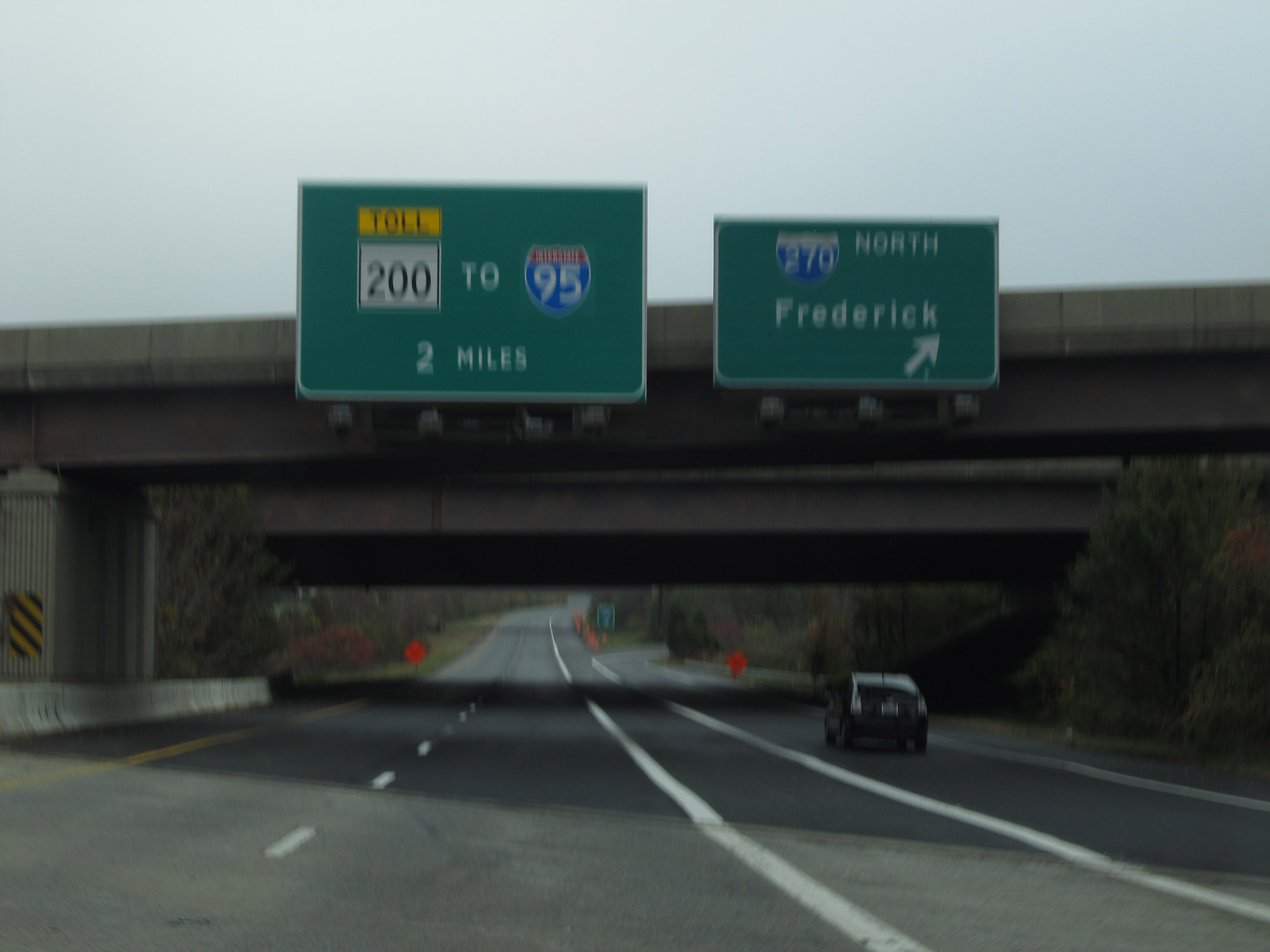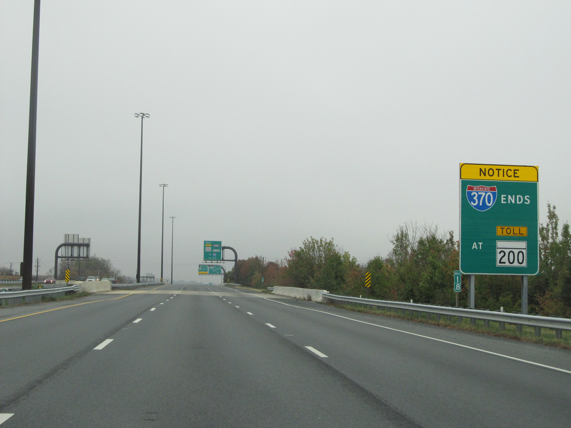 Interstate 370 East approaching its eastern terminus at the junction of MD 200 Toll - 1/2 mile. Toll payment on MD 200 is limited to EZ Pass only. There are no toll plazas and paying by mail is not an option. (Photo taken 11/5/15). |