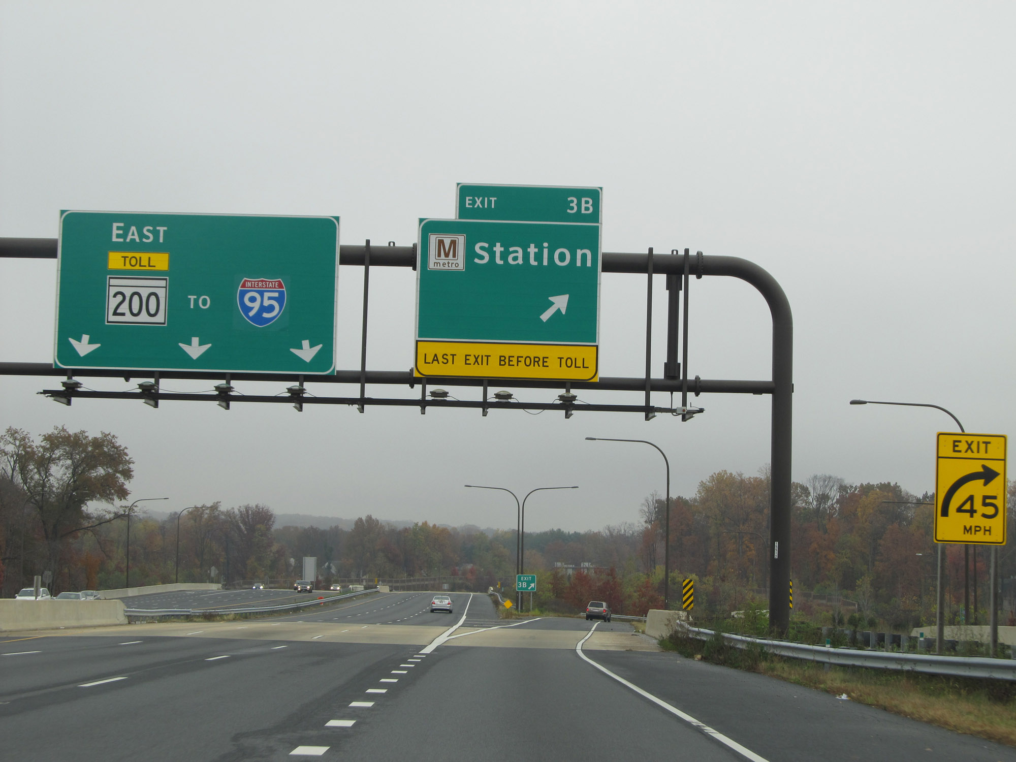 Interstate 370 East at Exit 3B: Metro Station. Immediately beyond this exit, Interstate 370 East ends its three eastbound lanes continue as MD 200 Toll East. (Photo taken 11/5/15). |