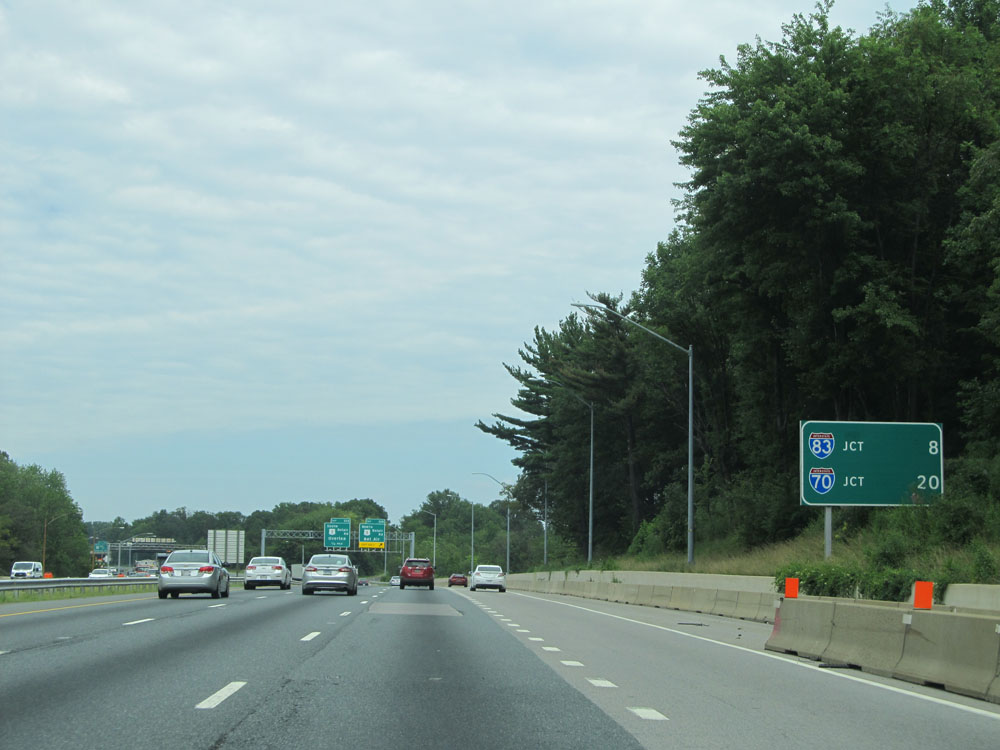 Sign listing the distances to the junctions of the next two 2-digit Interstates on I-695 Outer Loop. It's 8 miles to the junction of Interstate 83 and 20 miles to the junction of Interstate 70. (Photo taken 8/7/15).