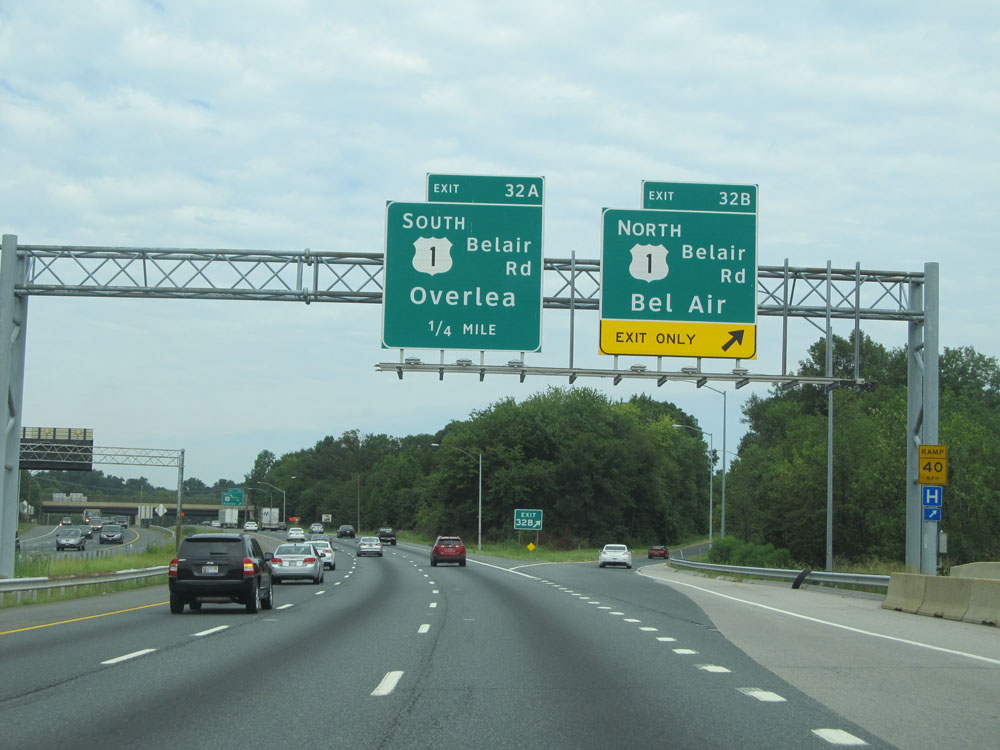 Interstate 695 Outer Loop (North) at Exit 32B: US 1 North - Belair Rd / Bel Air (Photo taken 8/7/15).