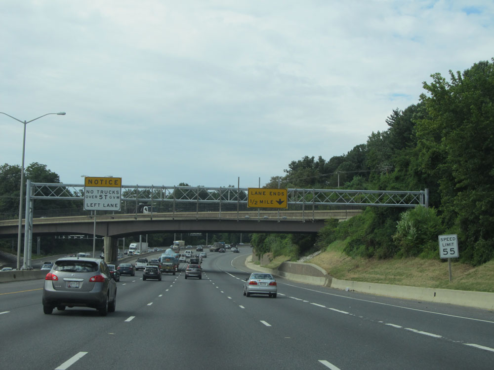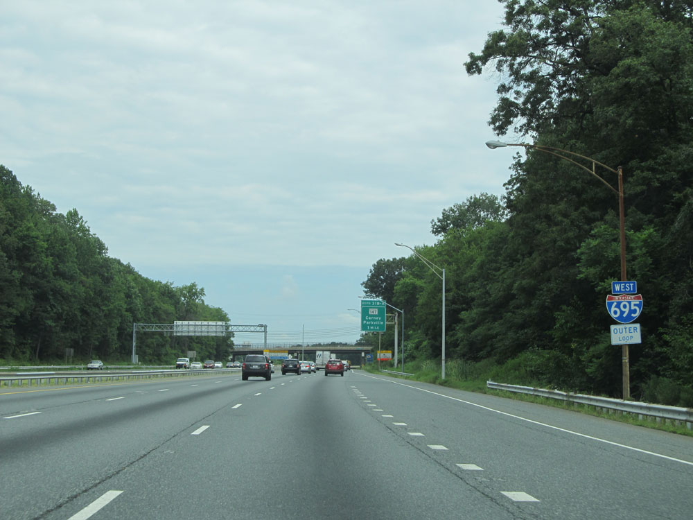 Interstate 695 Outer Loop (North) as it prepares to traverse a sharp right curve to the northwest of Essex. (Photo taken 8/9/15).