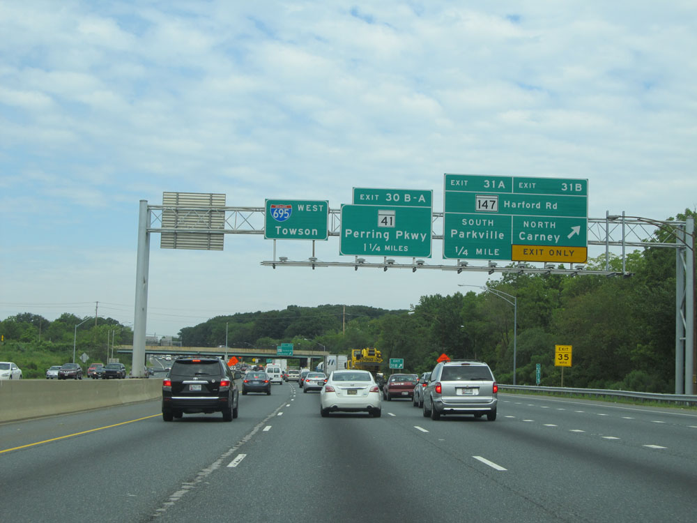 Interstate 695 Outer Loop (West) at Exit 31B: MD 147 North - Harford Rd / Carney (Photo taken 8/7/15).