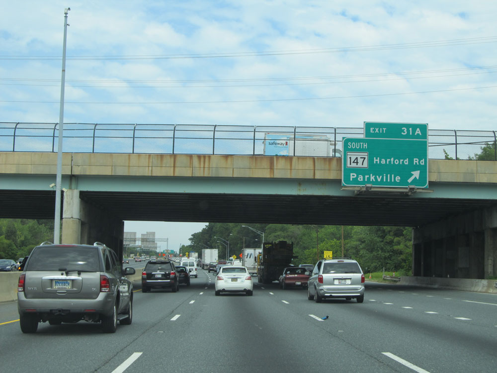 Interstate 695 Outer Loop (West) at Exit 31A: MD 147 South - Harford Rd / Parkville (Photo taken 8/7/15).
