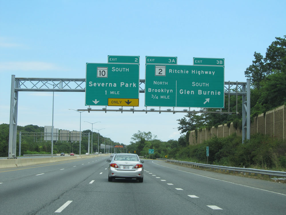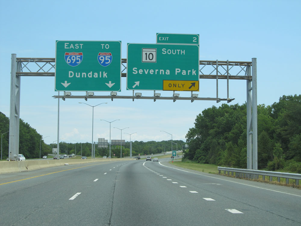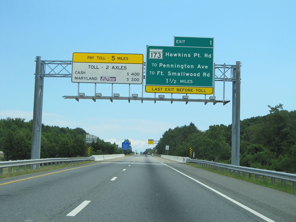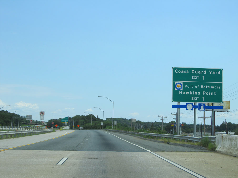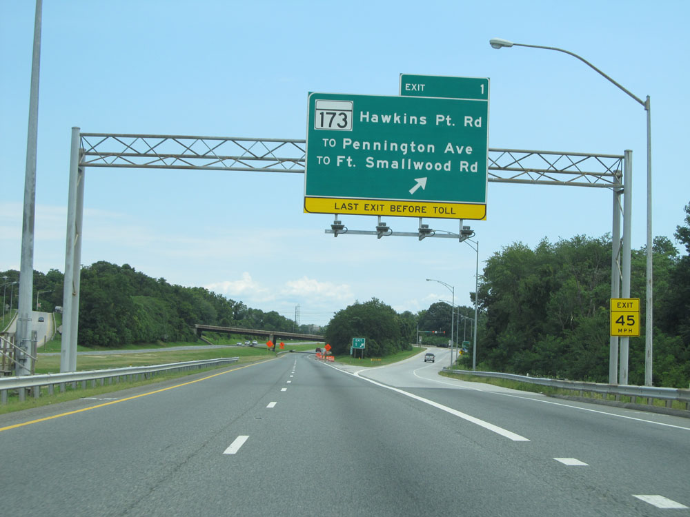 Interstate 695 Outer Loop (East) at Exit 1: MD 173 - Hawkins Point Rd / To Pennington Ave / To Ft. Smallwood Rd (Photo taken 8/9/15).