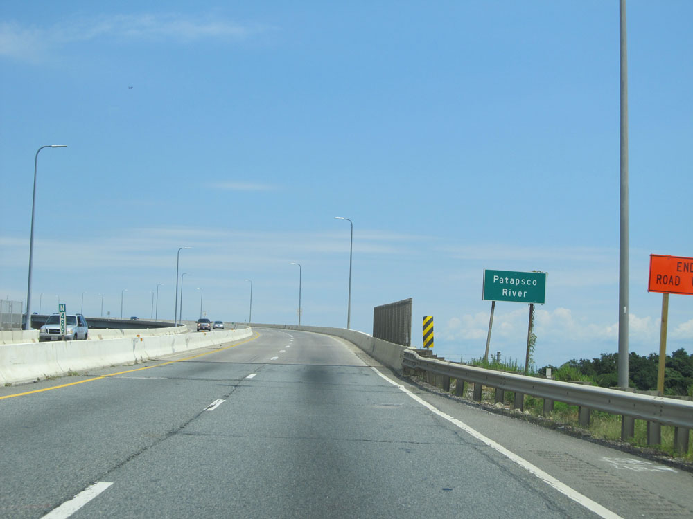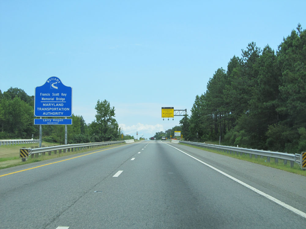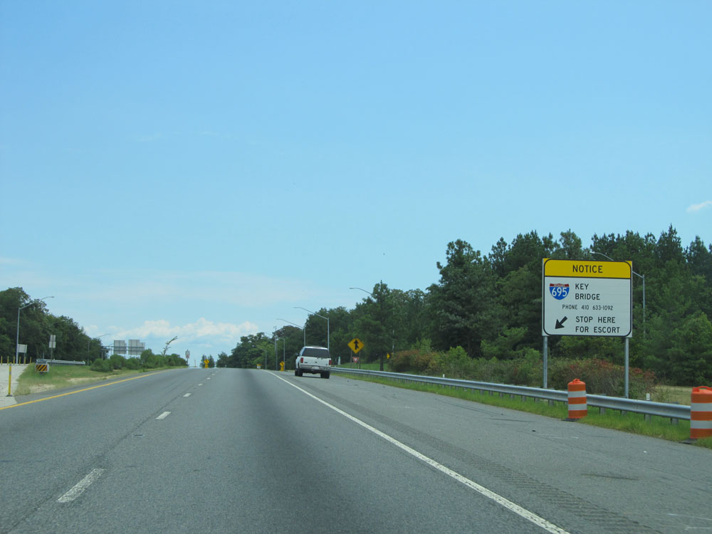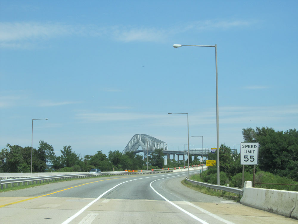 View on Interstate 695 Outer Loop (East) at mile marker 47.9, as the Key Bridge starts its descent back down to the toll plaza. (Photo taken 8/9/15).