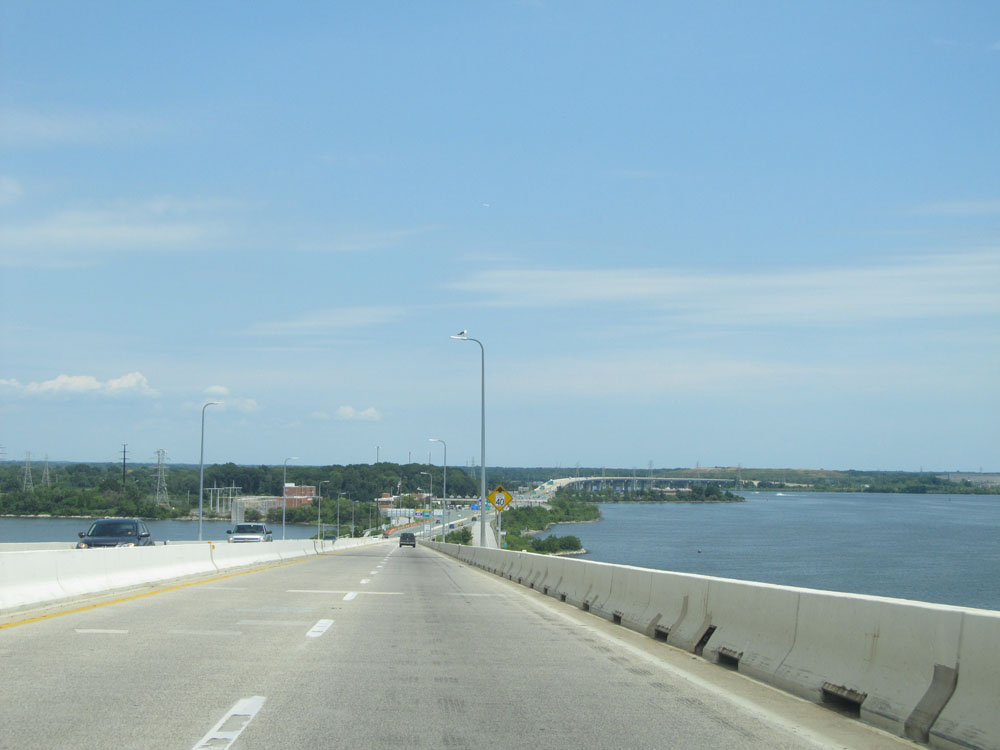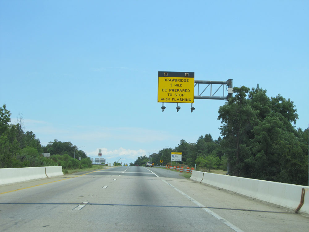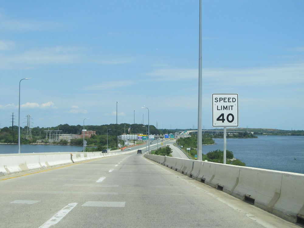 Interstate 695 Outer Loop crossing the Curtis Creek Drawbridge near mile marker 51. This is the point at which Interstate 695's mileage resets to 51.4, which makes it the official beginning/end of this beltway around the Baltimore area. (Photo taken 8/9/15).