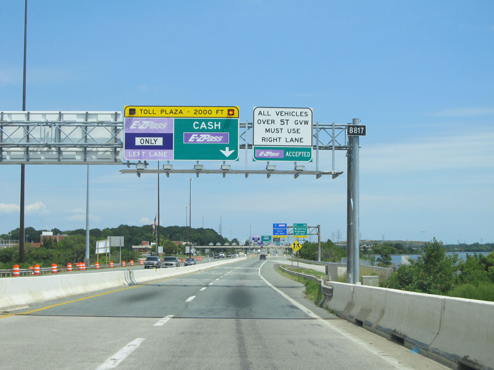 2000 feet from the toll plaza, these signs give toll payment instructions. EZ Pass is accepted in all lanes. Cash customers should keep to the right, while the left 4 lanes are for EZ Pass tagholders only. (Photo taken 8/9/15).