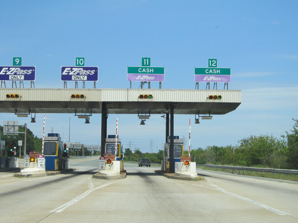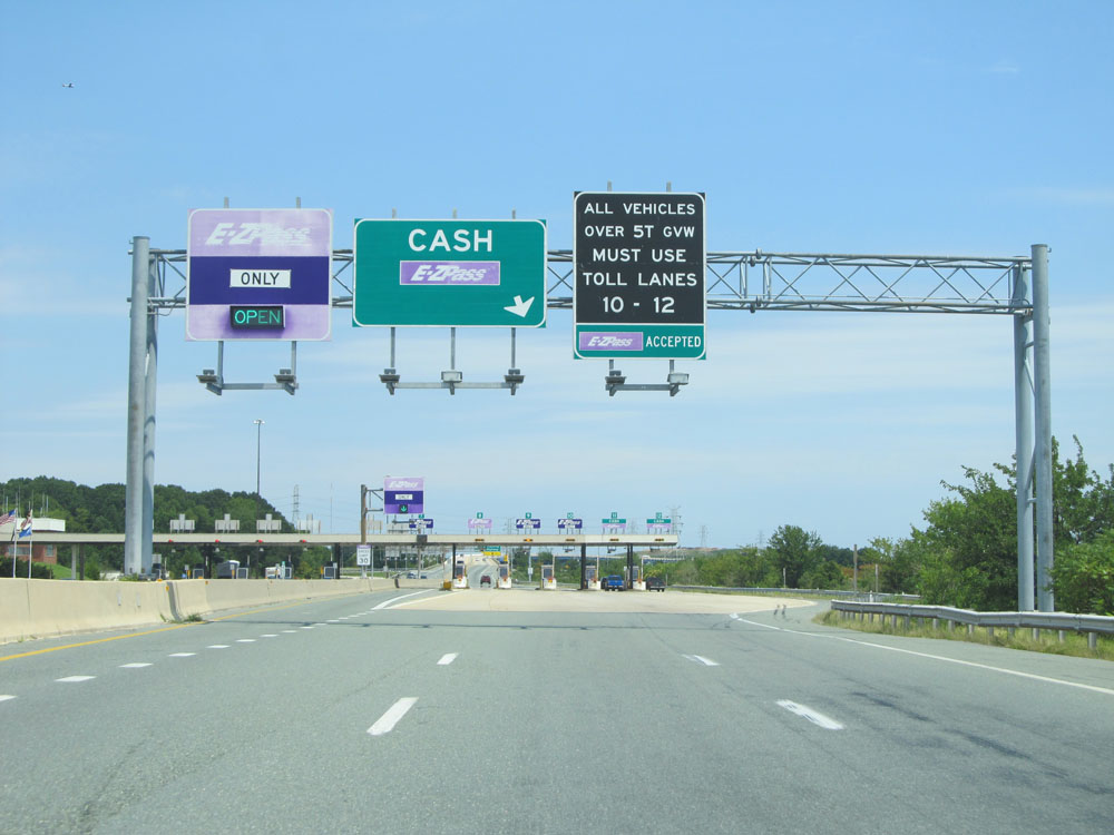 All trucks over 5 tons GVW (Gross Vehicle Weight) must use toll lanes 10-12 at the toll plaza, which are the three rightmost lanes. (Photo taken 8/9/15).