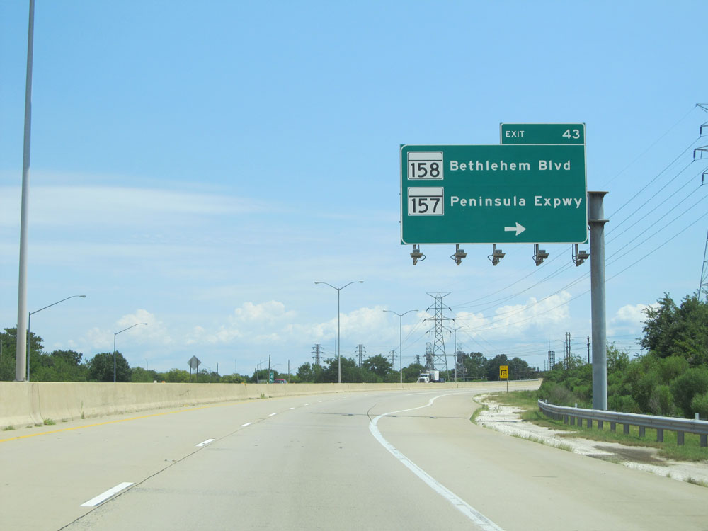 Interstate 695 Outer Loop (East) at Exit 43: MD 158 / MD 157 - Bethlehem Blvd / Peninsula Expwy (Photo taken 8/9/15).