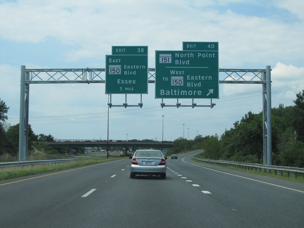 Interstate 695 Outer Loop (North) at Exit 40: MD 151 / To MD 150 West - North Point Blvd / Eastern Blvd / Baltimore (Photo taken 8/9/15).