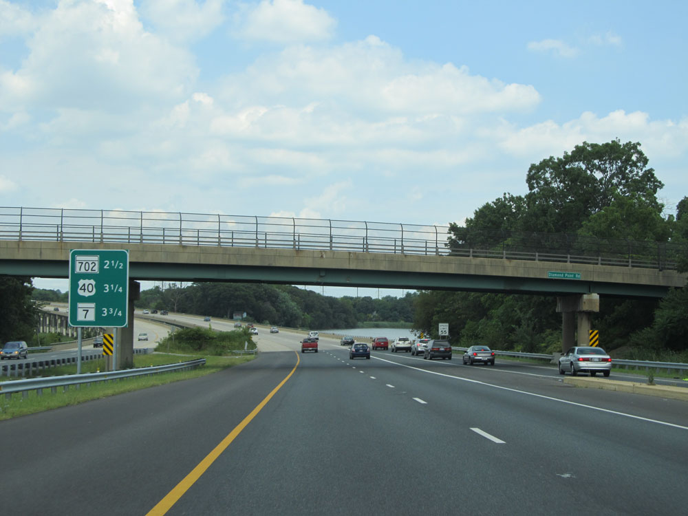 Sign listing the distances to the upcoming exits for MD 702, US 40, and MD 7. (Photo taken 8/9/15).
