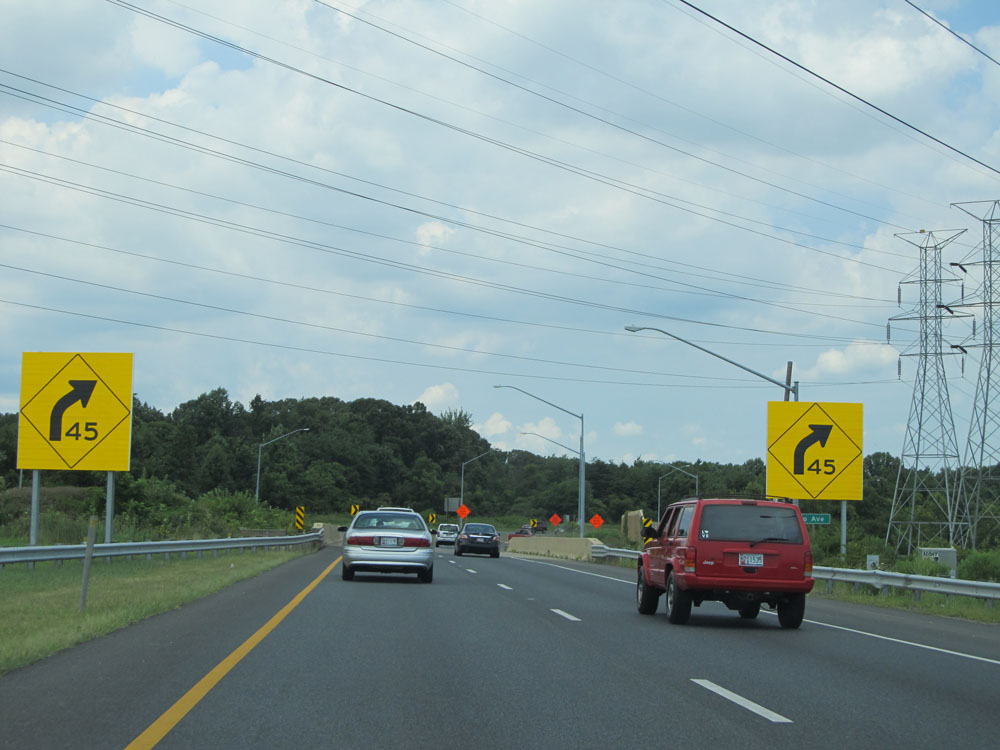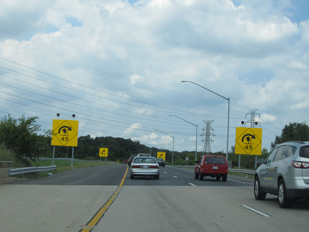 Interstate 695 Outer Loop (North) approaching a sharp 45 mph curve ahead. (Photo taken 8/9/15).