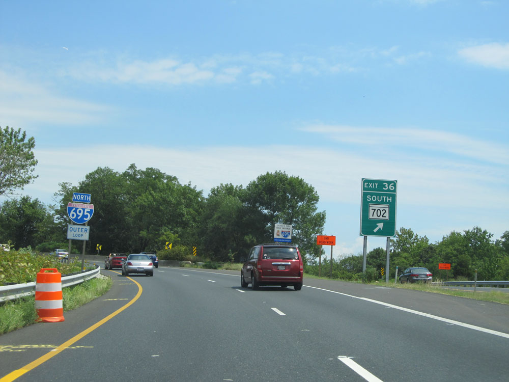 Interstate 695 Outer Loop (North) approaching Exit 36 - 1/2 mile. (Photo taken 8/9/15).