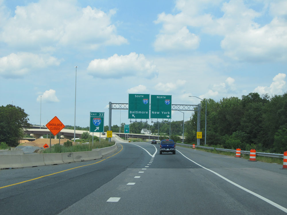 A closer view of the off ramp for Exit 33. Keep to the left for Interstate 95 South to Baltimore. Keep to the right for Interstate 95 North toward New York City. (Photo taken 8/9/15).