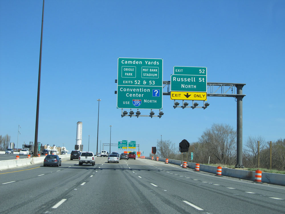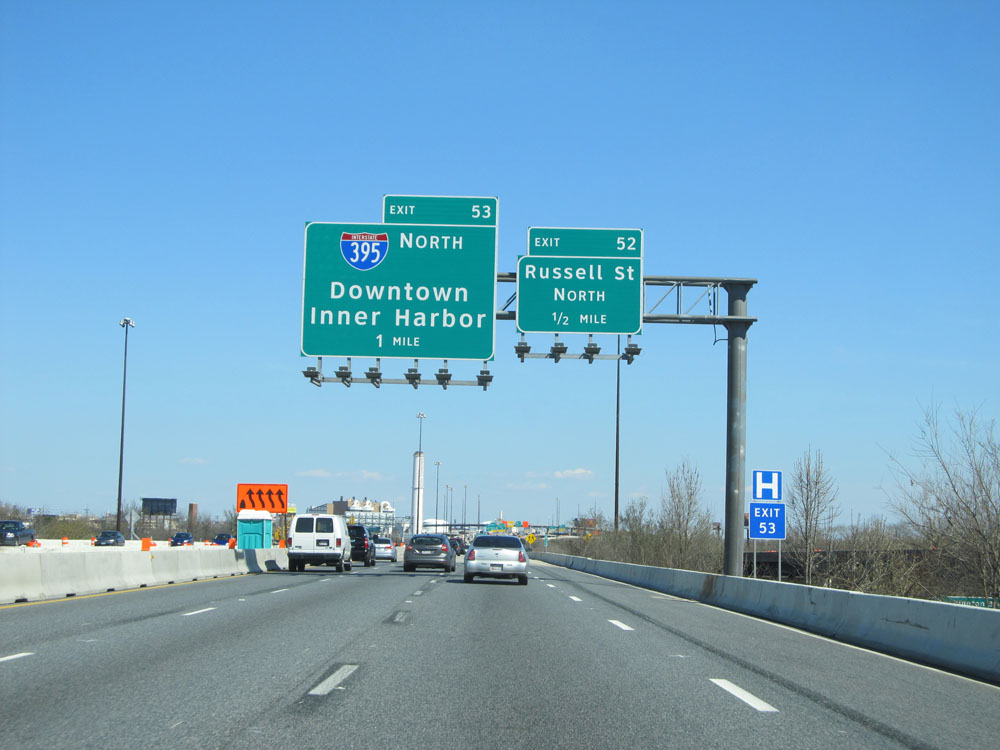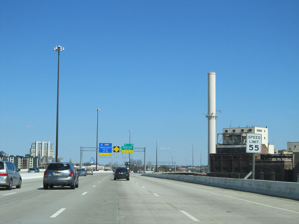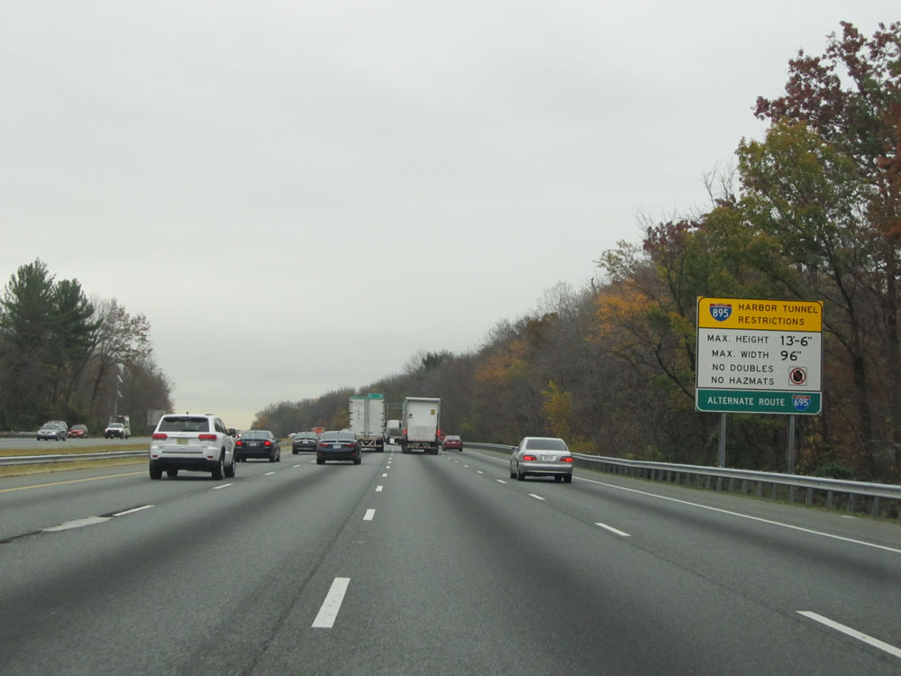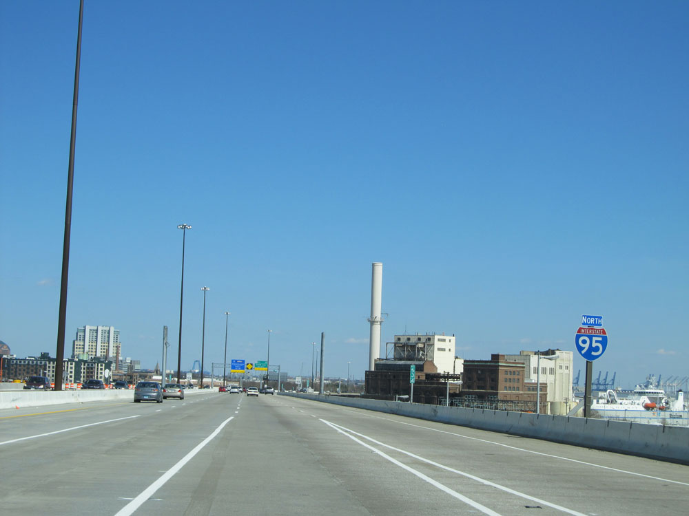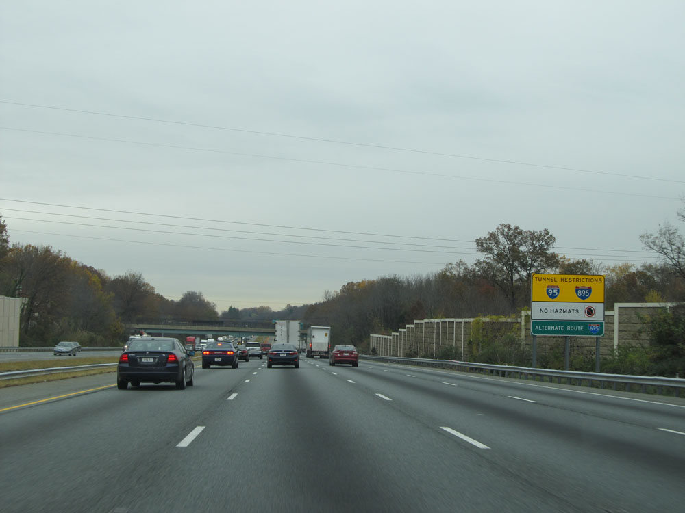 Interstate 95 North at Exit 55: Key Highway / Fort McHenry National Monument. Any commercial vehicles with hazardous materials must exit here, as Hazmat is prohibited through the Fort McHenry Tunnel ahead. (Photo taken 4/11/15).