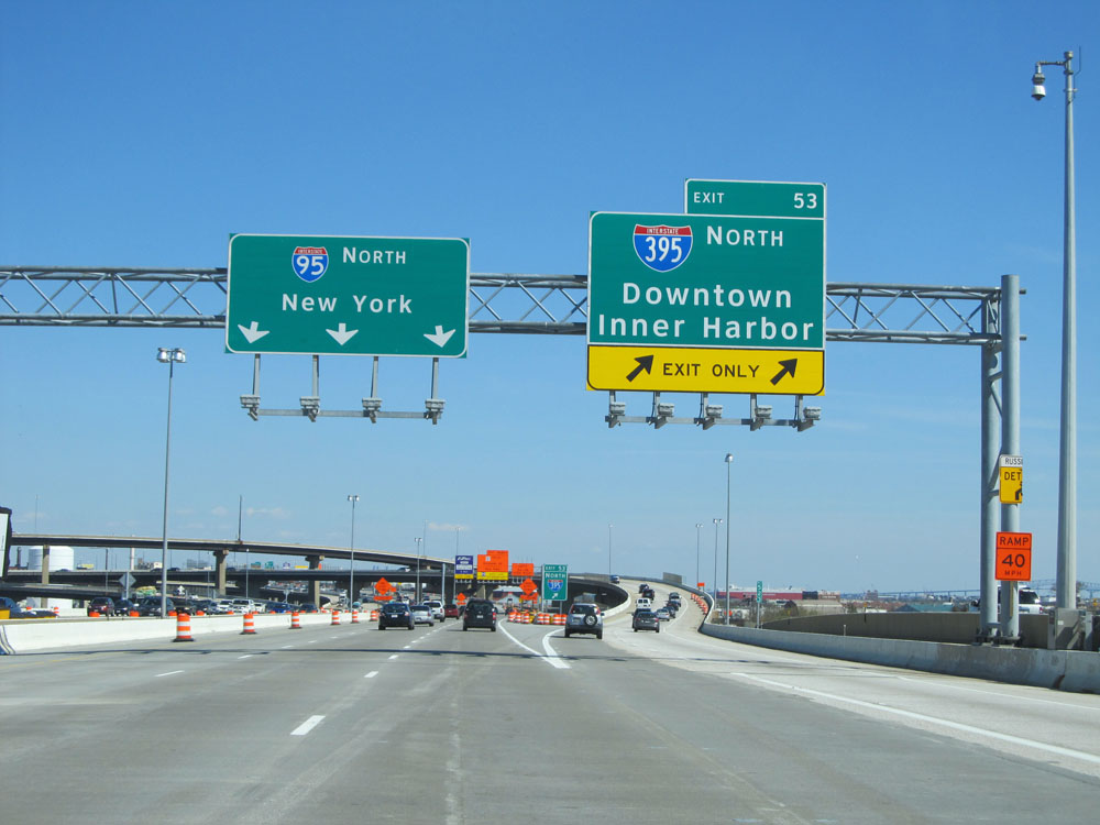 Interstate 95 North shield located at mile marker 53.4, in downtown Baltimore. (Photo taken 4/11/15).
