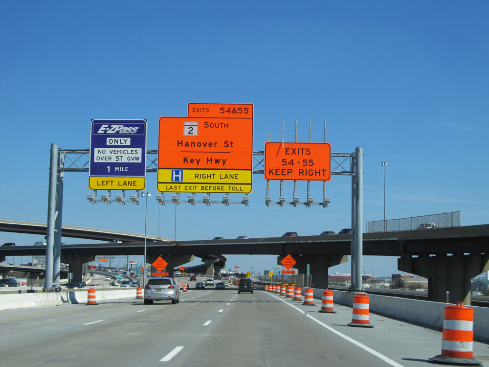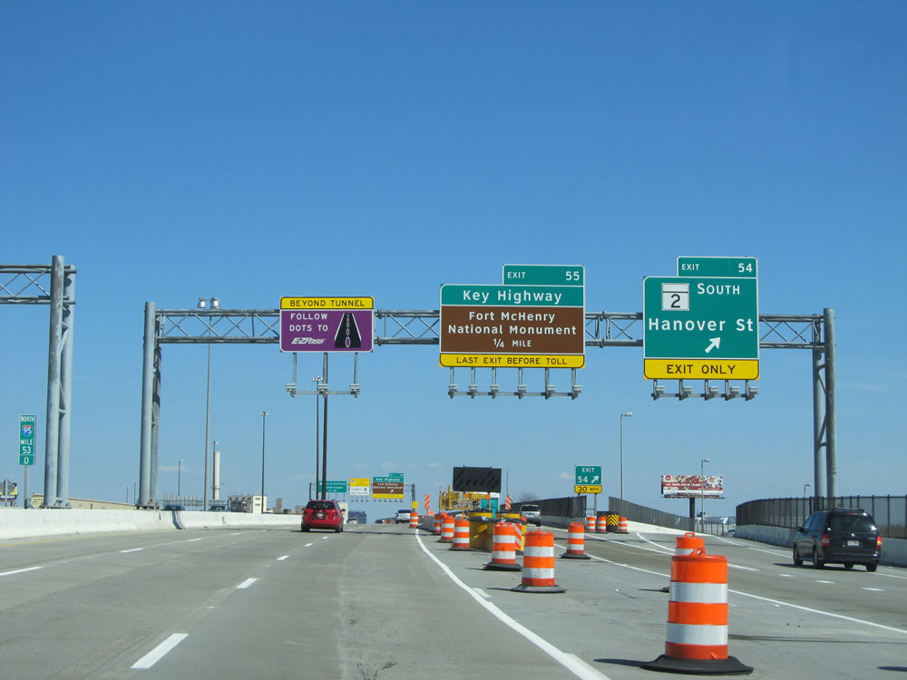 Exit 55 is the last exit before the upcoming toll plaza, on the other end of the Fort McHenry Tunnel. (Photo taken 4/11/15).