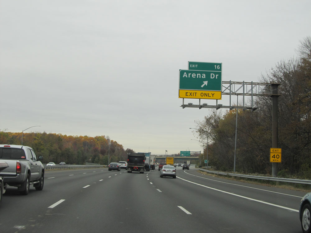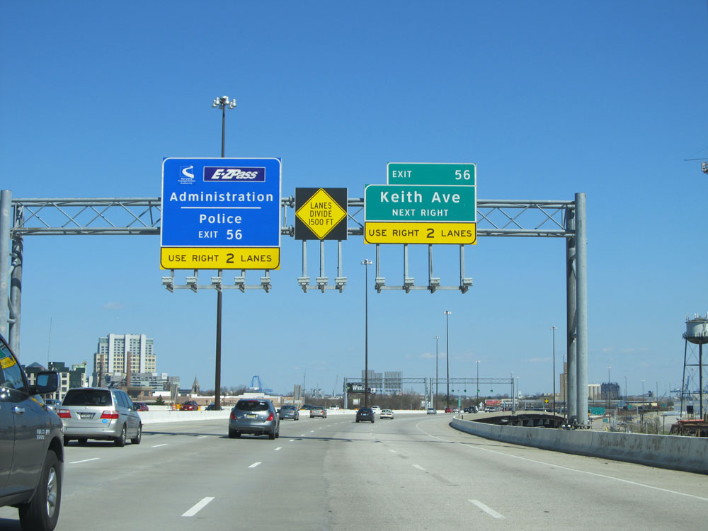 Interstate 95 North at Exit 56: Keith Ave. This exit is immediately, and I mean IMMEDIATELY, after the toll plaza. That is why being in the two rightmost toll lanes is crucial for accessing it. (Photo taken 4/11/15).