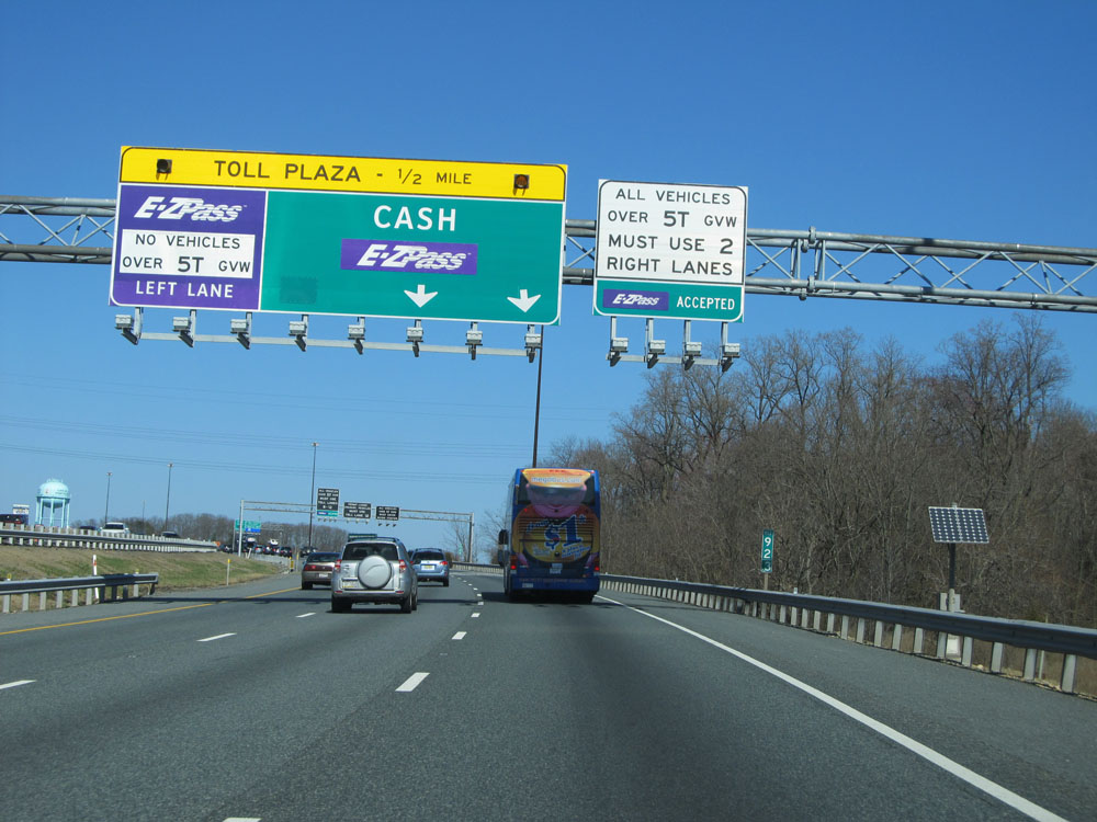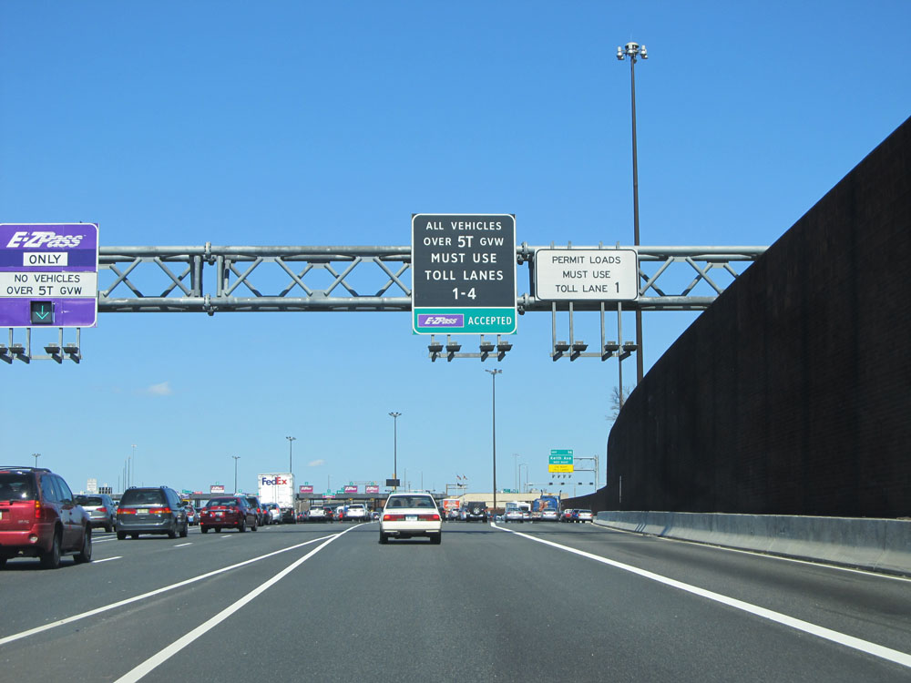 Upon exiting the tunnel on Interstate 95 North, there is usually quite a mess. Trucks are restricted to the four rightmost toll lanes. EZ Pass is accepted at all toll lanes, but cash customers must use lanes 1 or 2, which are the ones furthest to the right. At busy times, expect traffic to move slow approaching this toll plaza. (Photo taken 4/11/15).