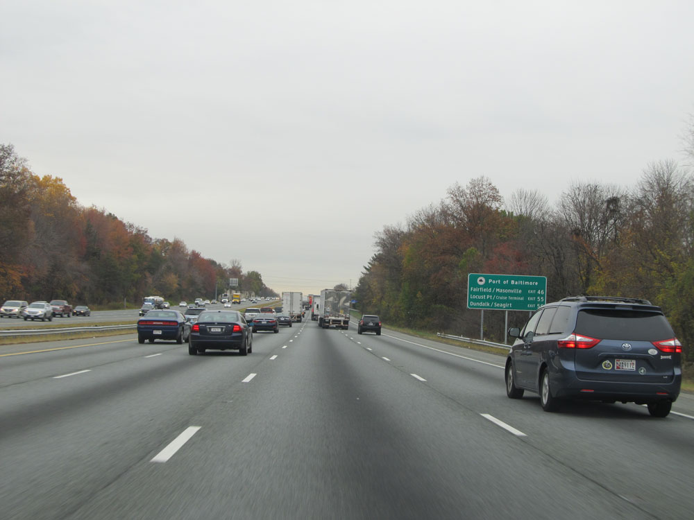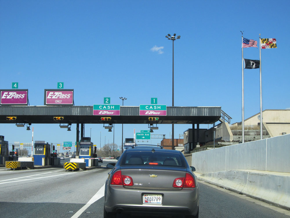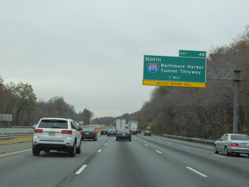If taking Exit 56, you will want to stay in the right two lanes. The reason for this is that the lanes split ahead just before entering the Fort McHenry Tunnel. Exit 56 lies just beyond the toll plaza at the other end of the tunnel. (Photo taken 4/11/15).