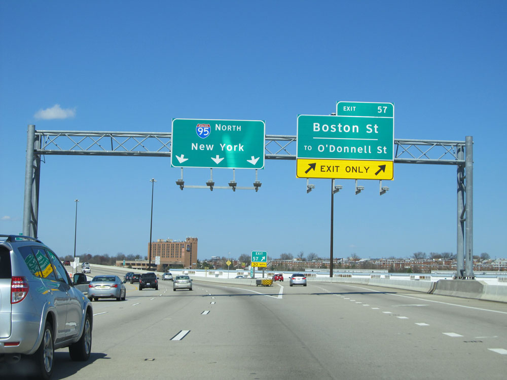 Interstate 95 North at Exit 57: Boston St / To O'Donnell St (Photo taken 4/11/15).