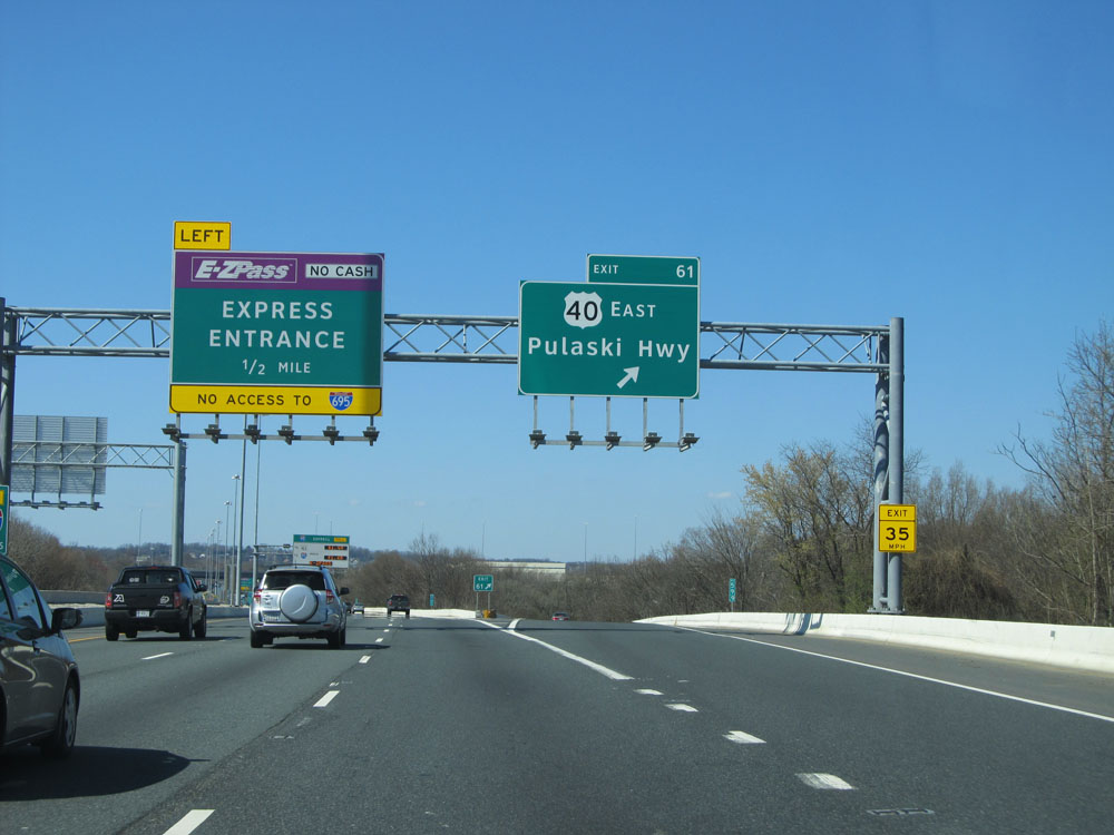 Interstate 95 North at Exit 61: US 40 East - Pulaski Hwy. To the left, 1/2 mile ahead, I-95 has express lanes. From these express lanes, there is NO access to Interstate 695. (Photo taken 4/11/15).